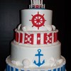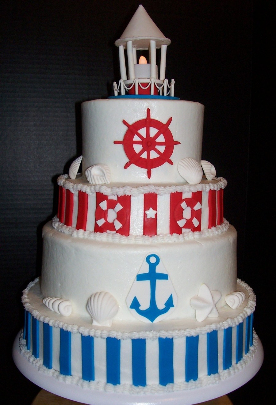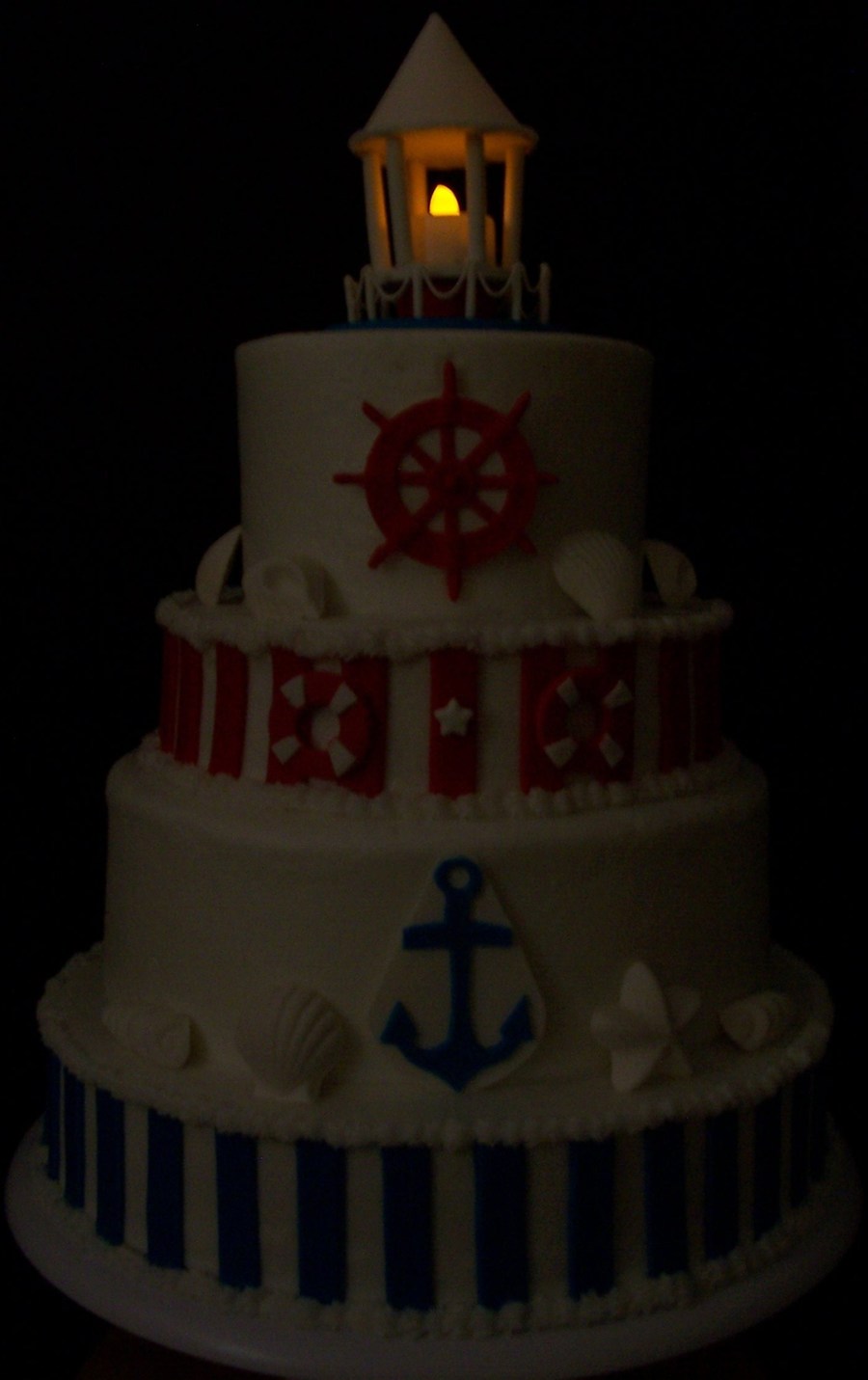 6,8,10 and 12 yellow cake is done in buttercream with fondant accents. Top of the Lighthouse is made of fondant, gumpaste, and royal icing. The roof is removable to accommodate a tea light flameless candle.