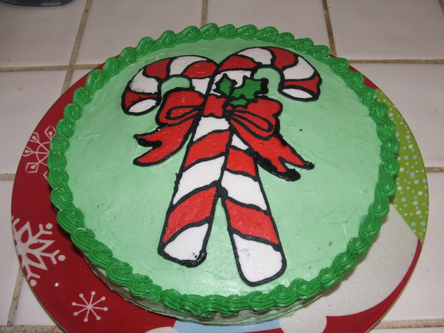 I made this cake for a little gathering my friends and I had at the holidays. The candy canes are done as a buttercream transfer.