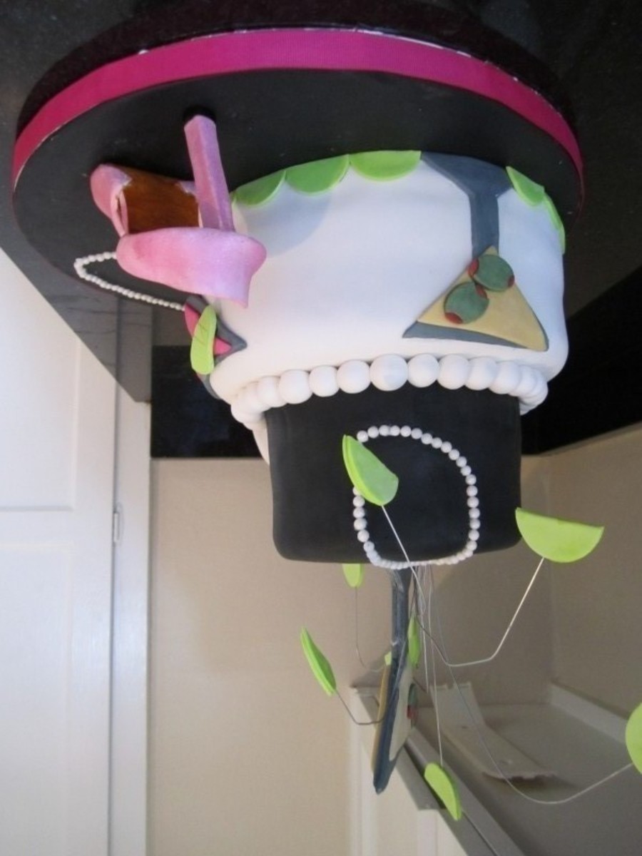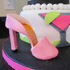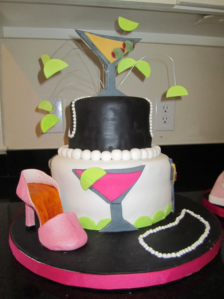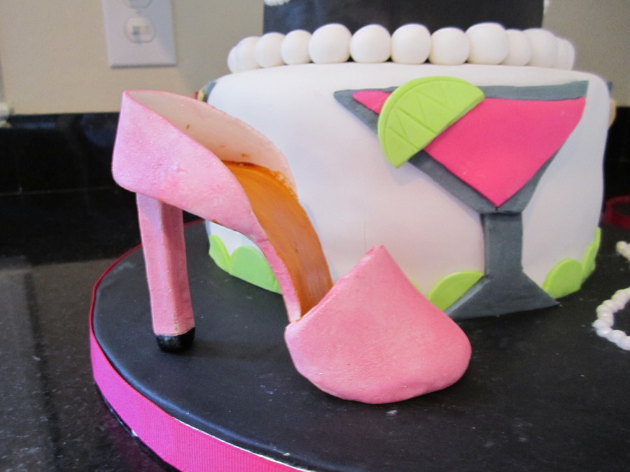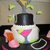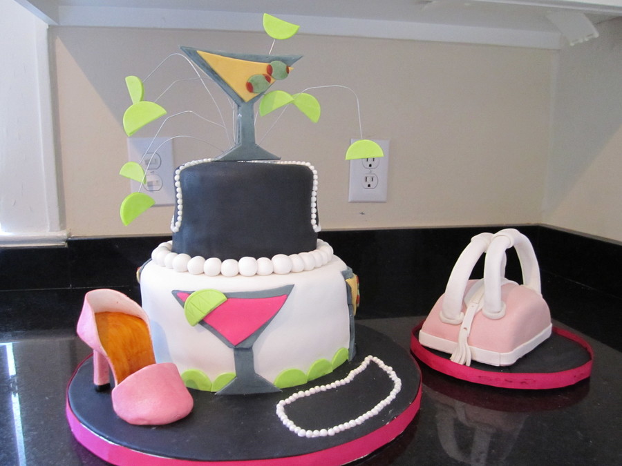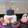 Cosmo's and Martinis on fondant covered cake. Gum paste shoe and pearls made of dragees. I tried to make a small purse cake to fit on the cake board but it was too big so it had to go beside it :)