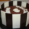 Mudcake surrounded by chocolate panels and with white chocolate letters and baby feet made in a mould.