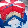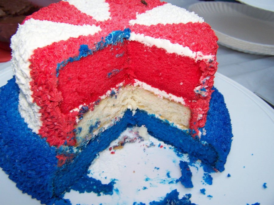 3 layer white cake- top layer dyed red and bottom layer dyed blue. buttercream icing. for our family to celebrate the 4th. thanks for the ideas on here.