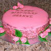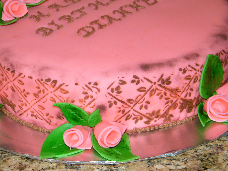 The intention was to make it looked aged so I did a dusty pink body in fondant...then I stenciled brown butter cream on the sides of the cake by doing some lighter in areas and darker in others and brushed on some brown dust to give it an aged look. This was a white chocolate cake with Strawberry cream cheese filling.