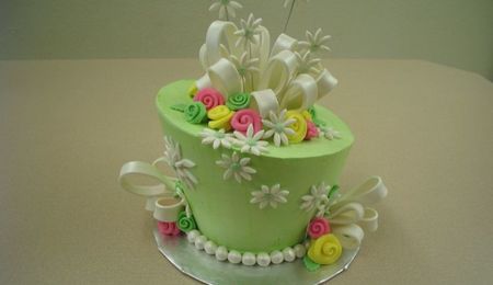 My FAVORITE cake to date -- so much fun! I love brides who are a little unconventional. Cake is 5-9-11-13. Yellow cake is straberry with bavarian cream, green margarita with lime curd, pink almond with almond cream, orange chocolate with espresso cream. All BC with fondant accents. Thanks for looking!