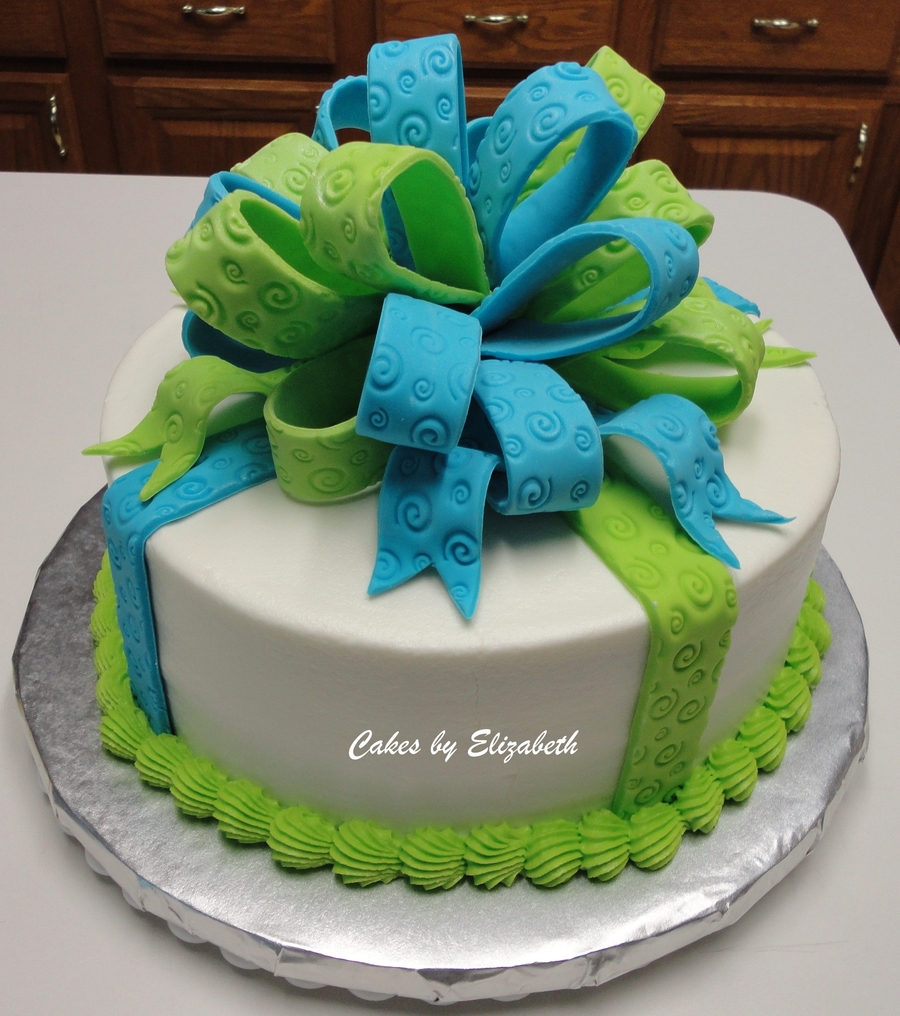 For my son's birthday. Round cake covered in buttercream with fondant bow.