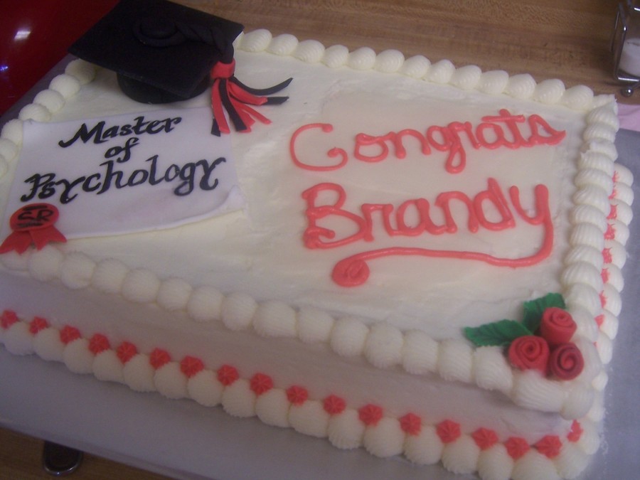 This was done for a lady who finally finished school with a degree in psychology. Cap, degree and roses all done in fondant with buttercream frosting.