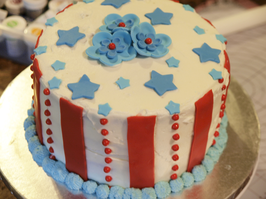 Independence Day cake. Buttercream with fondant accents. 4 layered white cake with a layer of whipped cream and raspberries, whipped cream and blueberries, and whipped cream and strawberries! Yum!