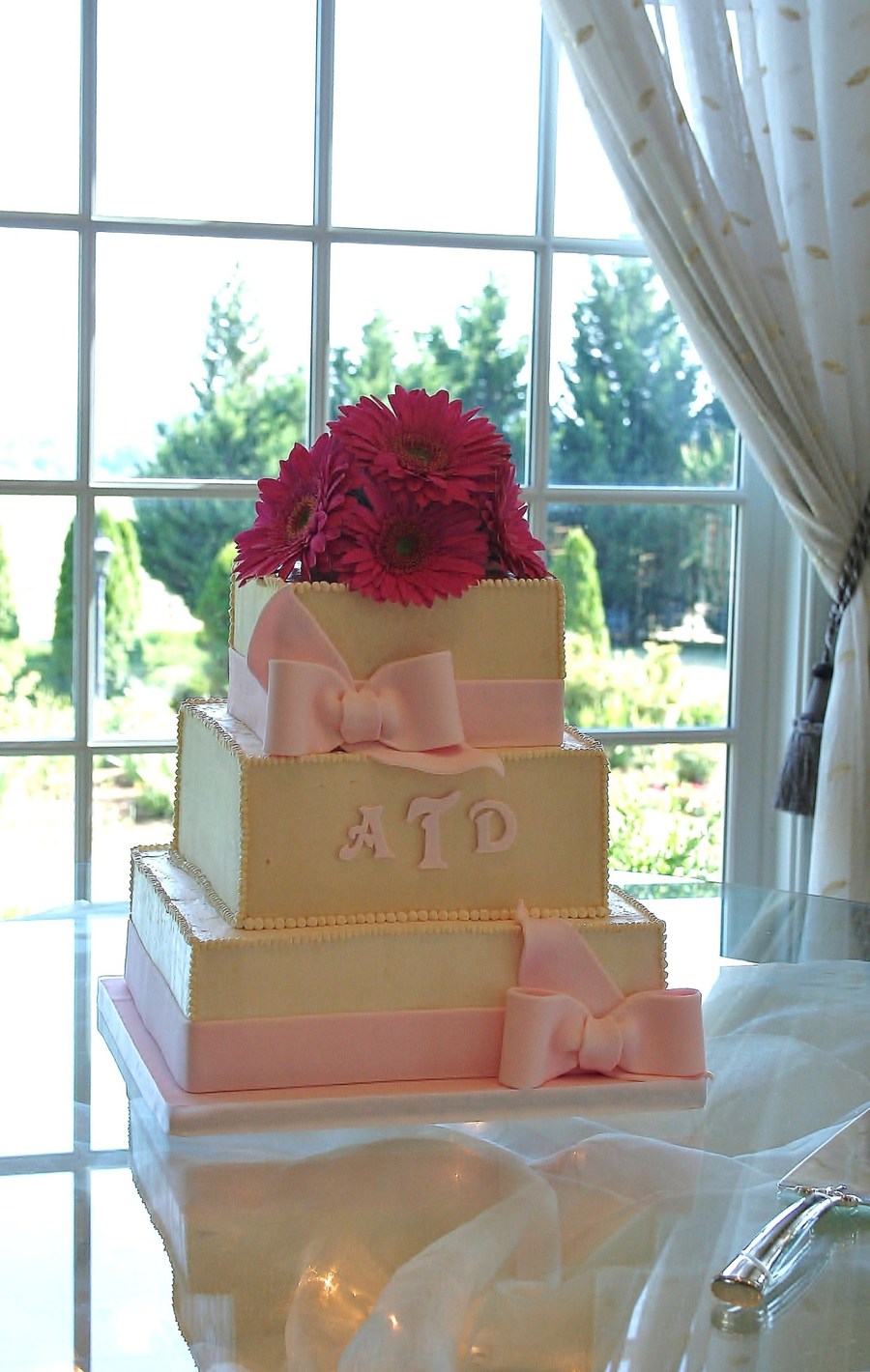 Square cake covered in smbc, Bow, banding, monogram fondant. Flowers were fresh provided by the venue at the brides request. dont usually do fresh flowers. Thank to sugarshack and her buttercream dvd (yes you cna use it with smbc, just leave out paper towel and paper portions). Bride wanted piped "pearls" on all the edges but trust me those edges were SHARP under there.