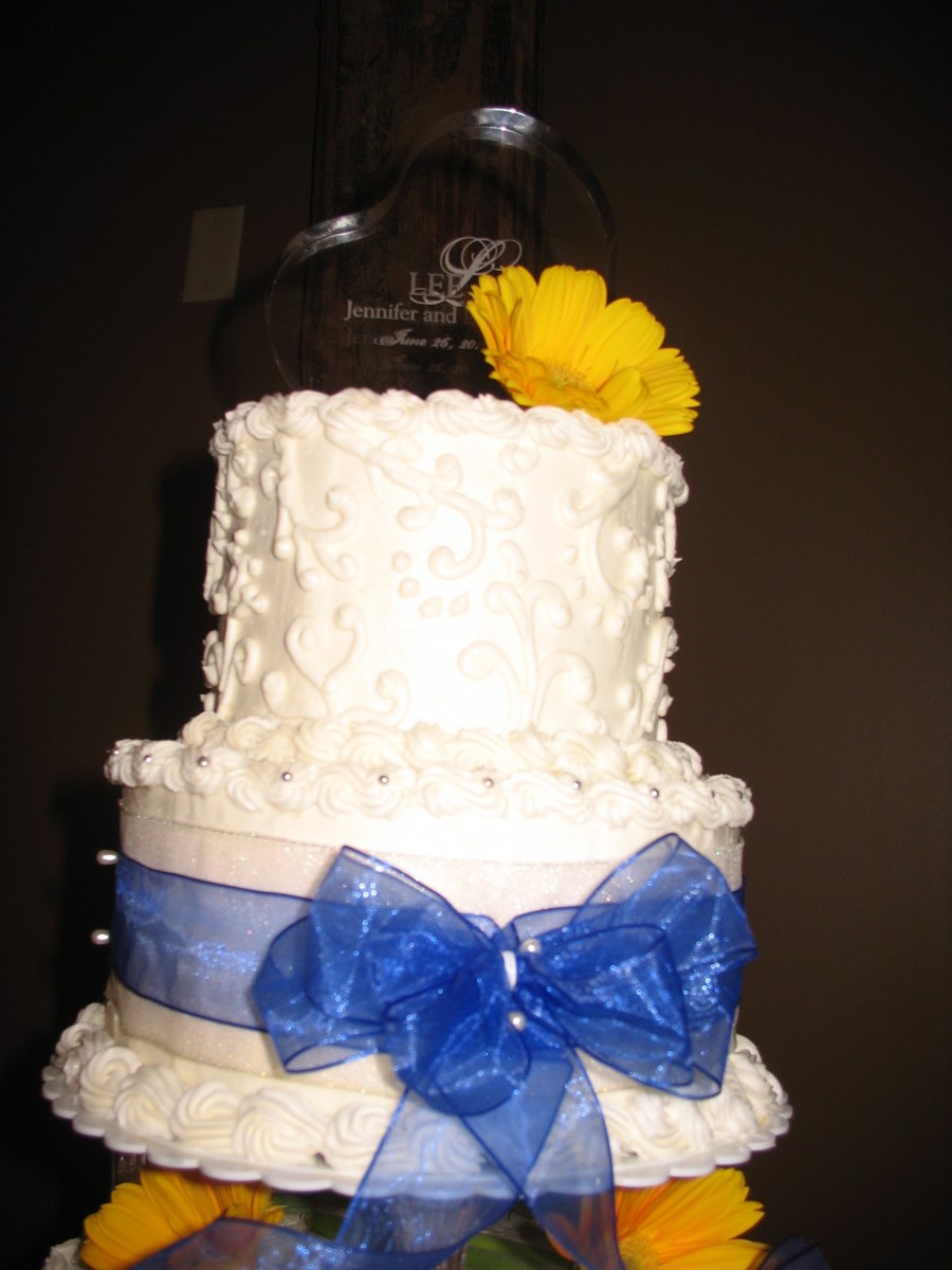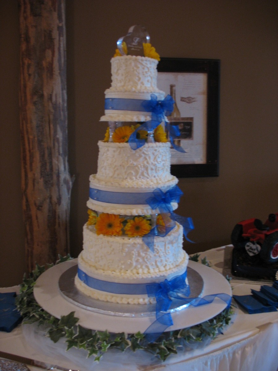 Buttercream iced cake with each tier a different flavor. Wht/Wht, Raspberry swirl/ Swirl, Carrot/ Cream Cheese, Butter Pecan, With Almond Pecan, Chocolate Swirl/Wht, and Mocha/ Vanilla. Grooms cake sittining nearby was triple chocolate with fudge frosting! Requested by the groom. All Buttercream with real ribbon and flowers. This cake looks like its leaning...but I have decided that I really can't stand straight when i take pictures.