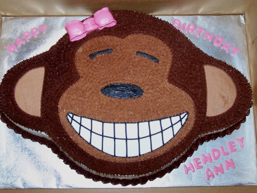 This is a different version of my monkey cake. I used a 10-inch round for the monkey head and a small oval pan, which I cut in half for the ears. The cake is decorated with B/C icing and the bow is made from MMF as is the birthday message.