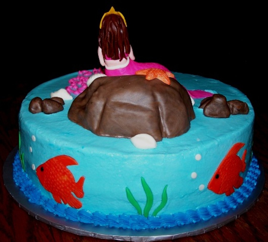 This cake was made using two 10-inch rounds. the cake was iced with B/C icing and accented with MMF. The gold fish were cut out using cookie cutters then textured by hand. The large rock was sculpted from cake then covered with MMF. The mermaid was sculpted from MMF. The seashells were made using MMF and shell molds.