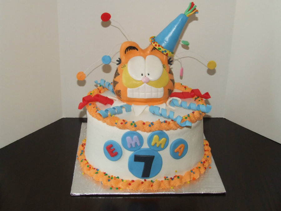 Garfield's head is made from rice krispies covered in fondant, hat is fondant covered ice cream cone, curly ribbons are gumpaste. Cake is iced in buttercream, and covers choc and vanilla layers of cake and choc and vanilla buttercream. LOved doing this cake!