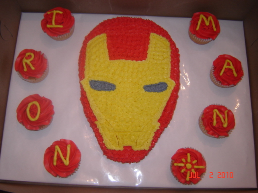 Ironman made with a altered 10 inch round cake, matching cupcakes.
