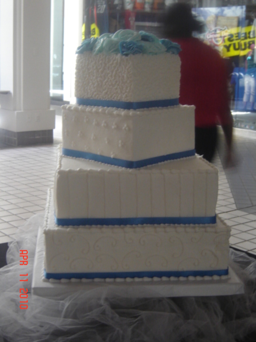 A local town had a wedding cake contest. So this was my entry. It was alot of fun. Its a cake dummy. I got the idea for the offset tiers from someone on CC..sorry I cant remember who. Buttercream flowers on top. I had a great time. Thanks for looking