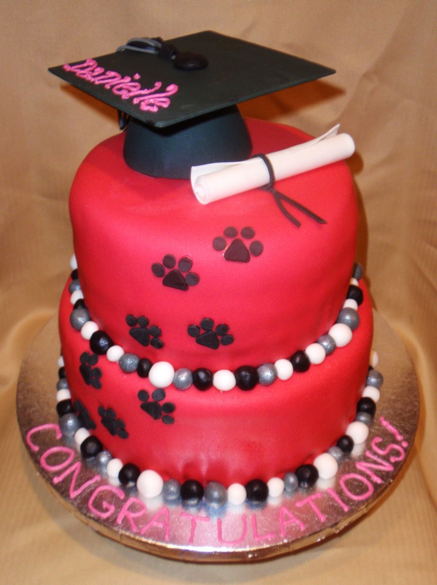 Fondant covered with fondant ball trim and paw prints. Gumpaste cap and diploma.