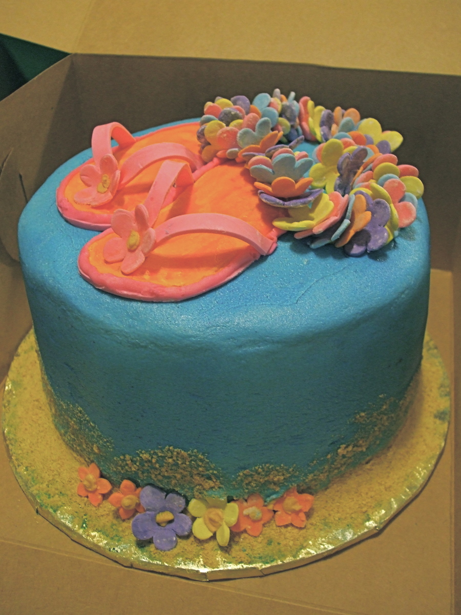 My camera didn't seem able to take a good picture of this cake; the colors are all washed out. Shoes and lei are made of gumpaste. I strung the flowers onto dental floss but next time I do it I think I'll put a small fondant bead in between each flower. Otherwise, I'm happy with this cake experiment. :)