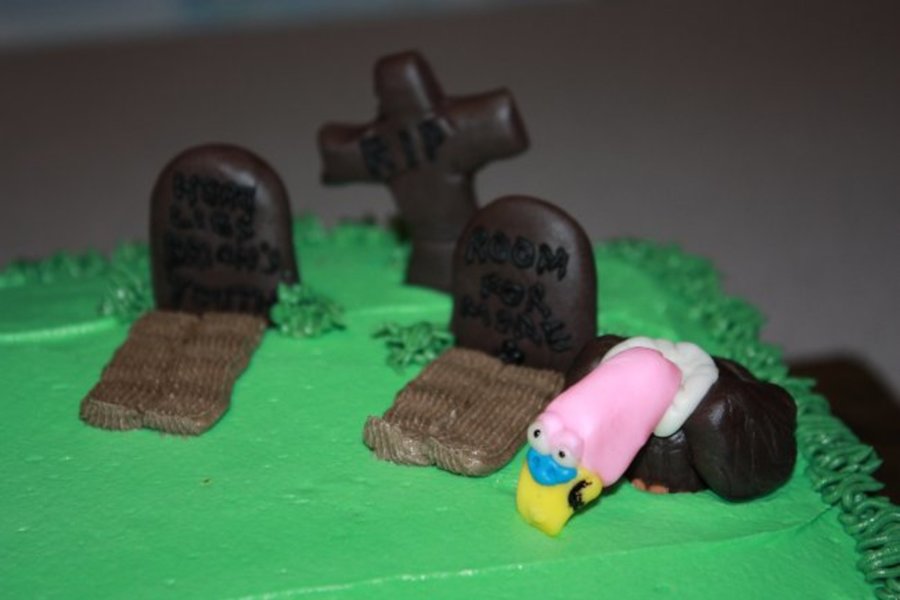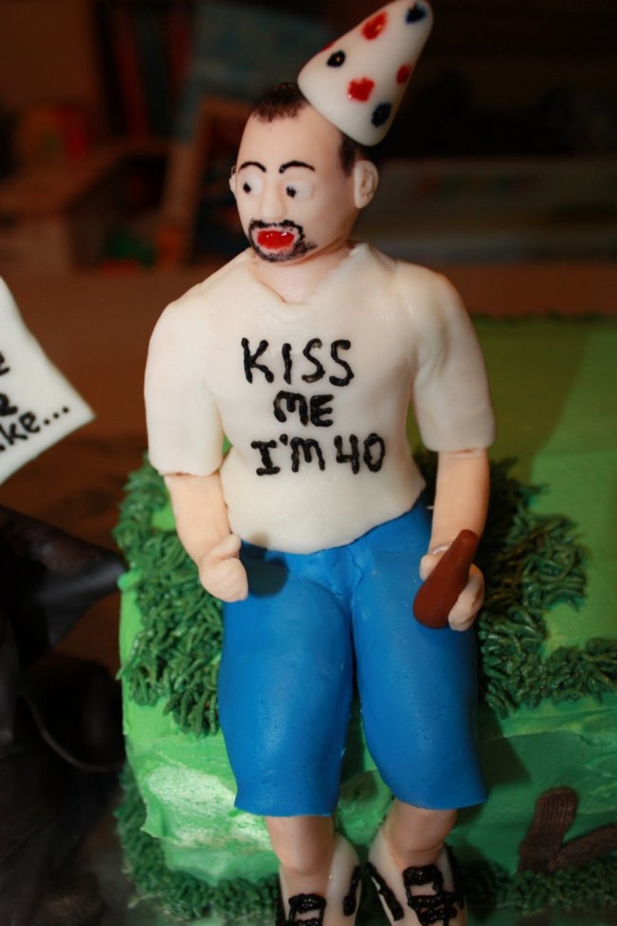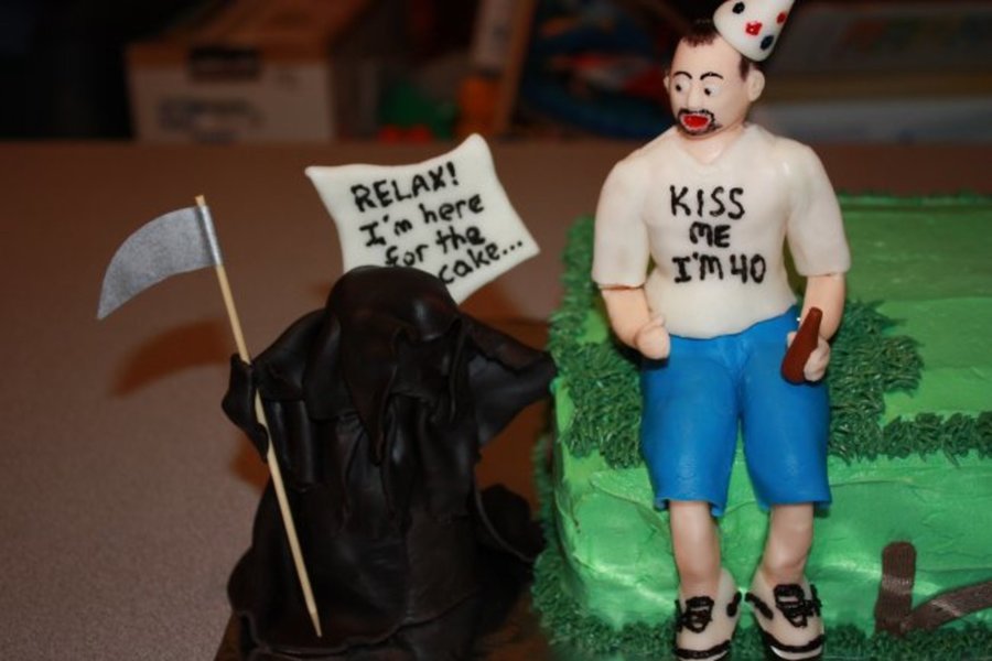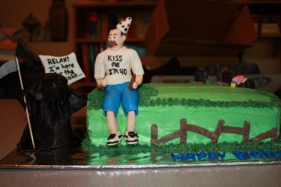 My friend's B-Day cake. He's turning 40 and wanted a cake that poked fun at his age. I made a butter cream icing cake with fondant figures. I am actually amazed the guy really looks like the real thing!