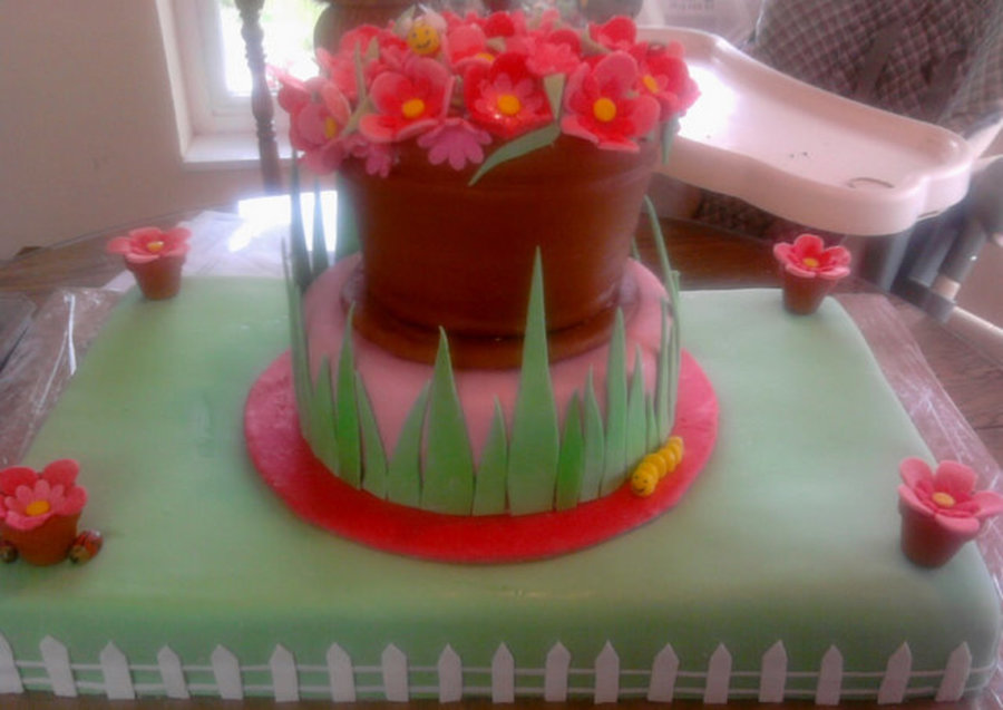 a garden themed cake with a carved pot and fondant flowers. The picket fence was a last minute detail, i had alot of fun with this cake.