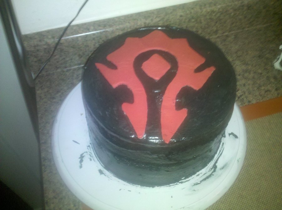 My friend that I play the game World of Warcraft with is coming up to Chicago for a family wedding so he is stopping by. I told him I would make him a cake. We play horde so this seemed appropriate. The cake is a sugar cookie cake with cream cheese frosting. The horde crest is fondant. It was hot in my kitchen so everything is a little melted. Should taste good though!