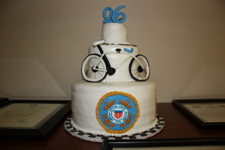 This cake was for a gentleman that likes bicycling. He retired from the Coast Guard after 26 years of service. My husband took the pictures at work and I was told this cake was outdoors so it started to melt.