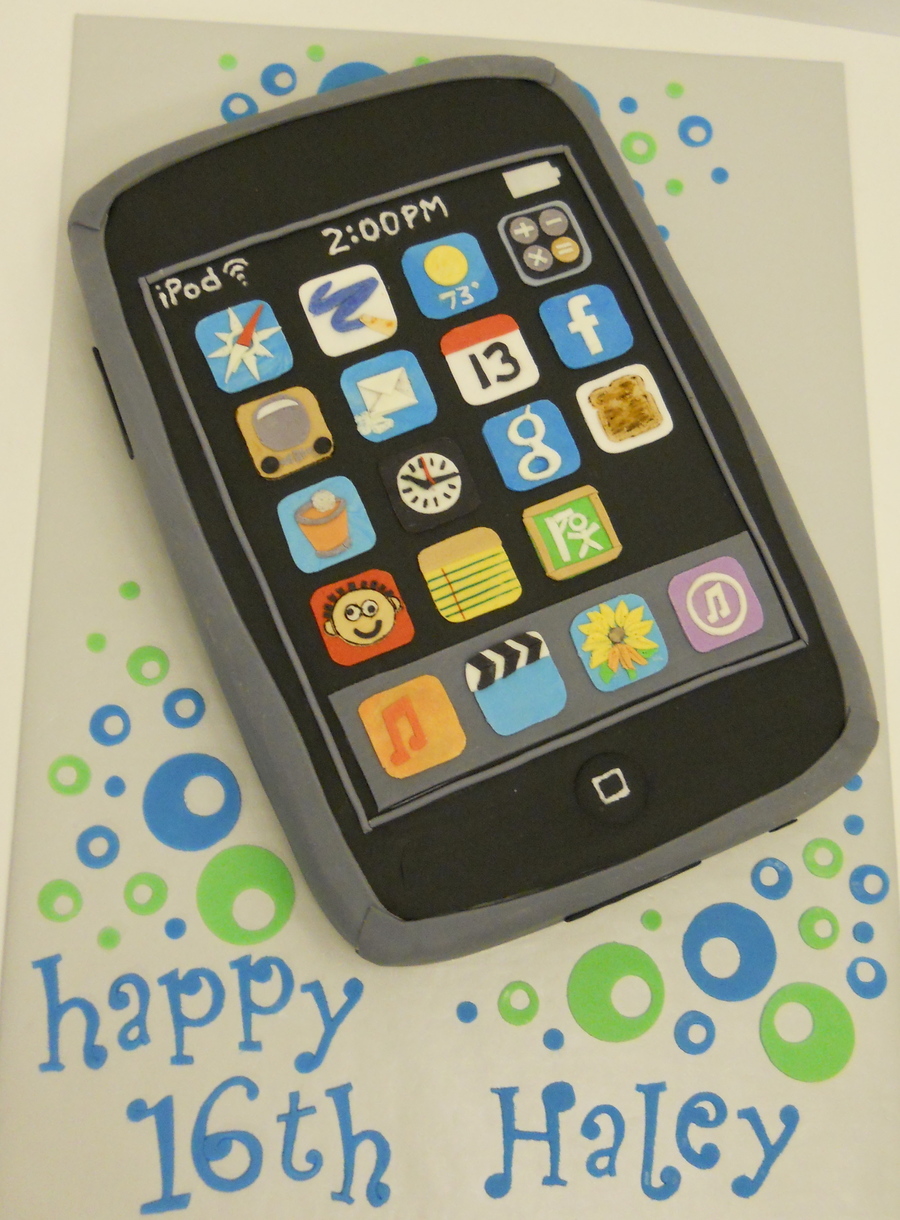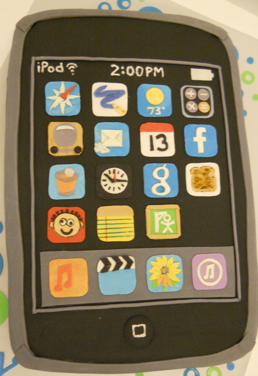 9x13 cake- Fondant iced with gum paste 'apps' and gum paste lettering on the board.