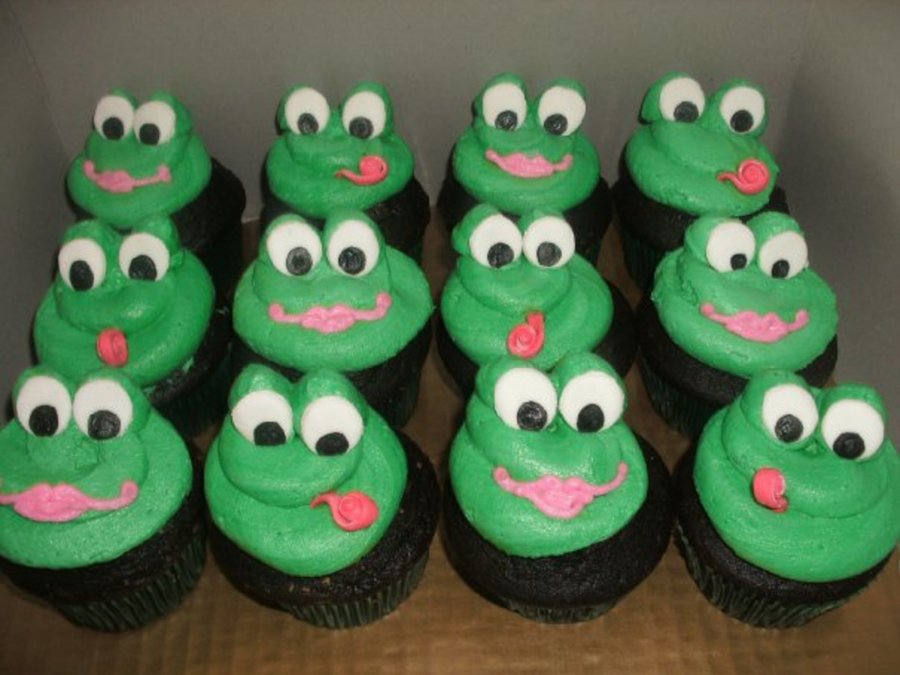 chocolate cupcakes filled with peanut butter cups, topped with peanut butter buttercream tinted green, to go with a frog theme birthday cake