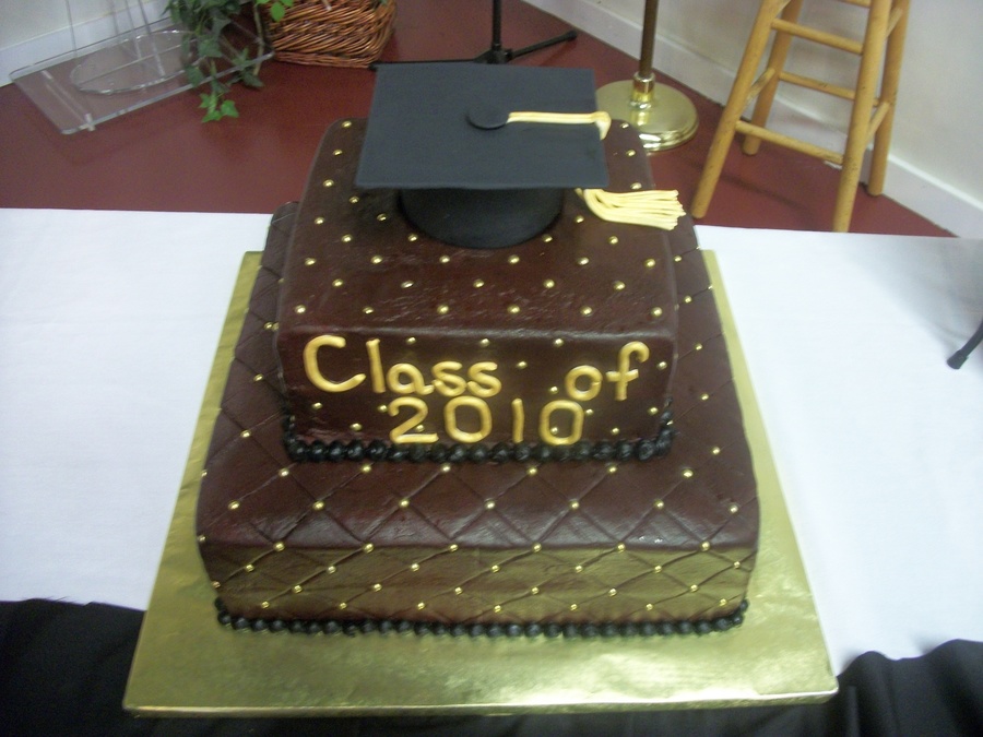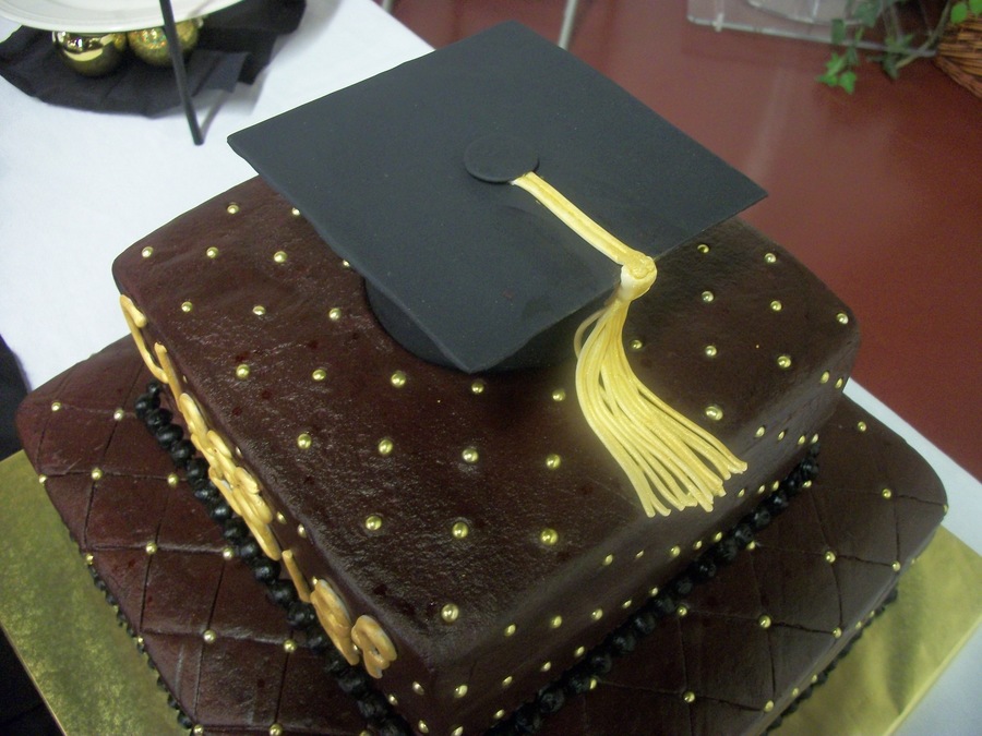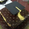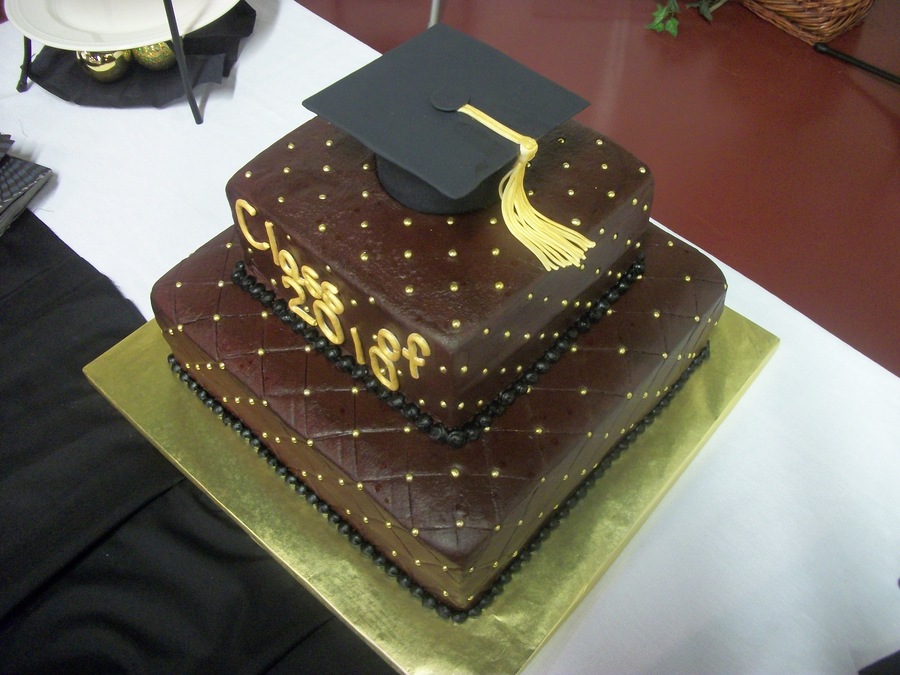 This cake was an 8" lemon cake with a lemon BC filing and a 12" butter cake with chocolate filling. It is covered in BC with gold dragees. The graduation cap is fondant.