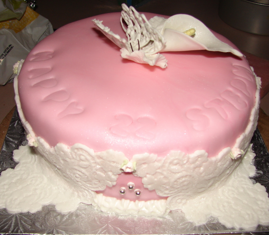 banana cake with strawberry flavor fondant, buterfly was pastillage and the calla lilly also pastillage