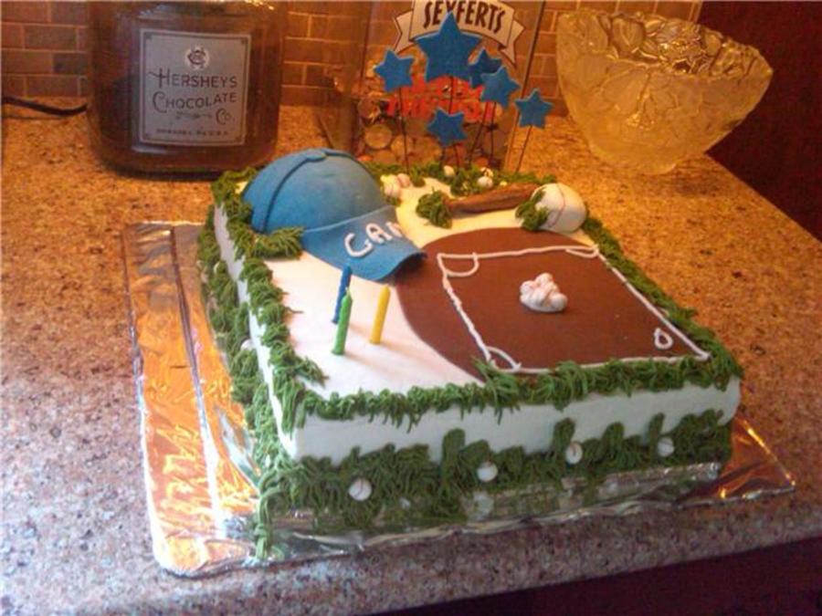 WASC, torted and filled w/ bc. Covered in BC. Chocolate fondant baseball diamond, gumpaste bat, cap, and baseballs. BC grass.