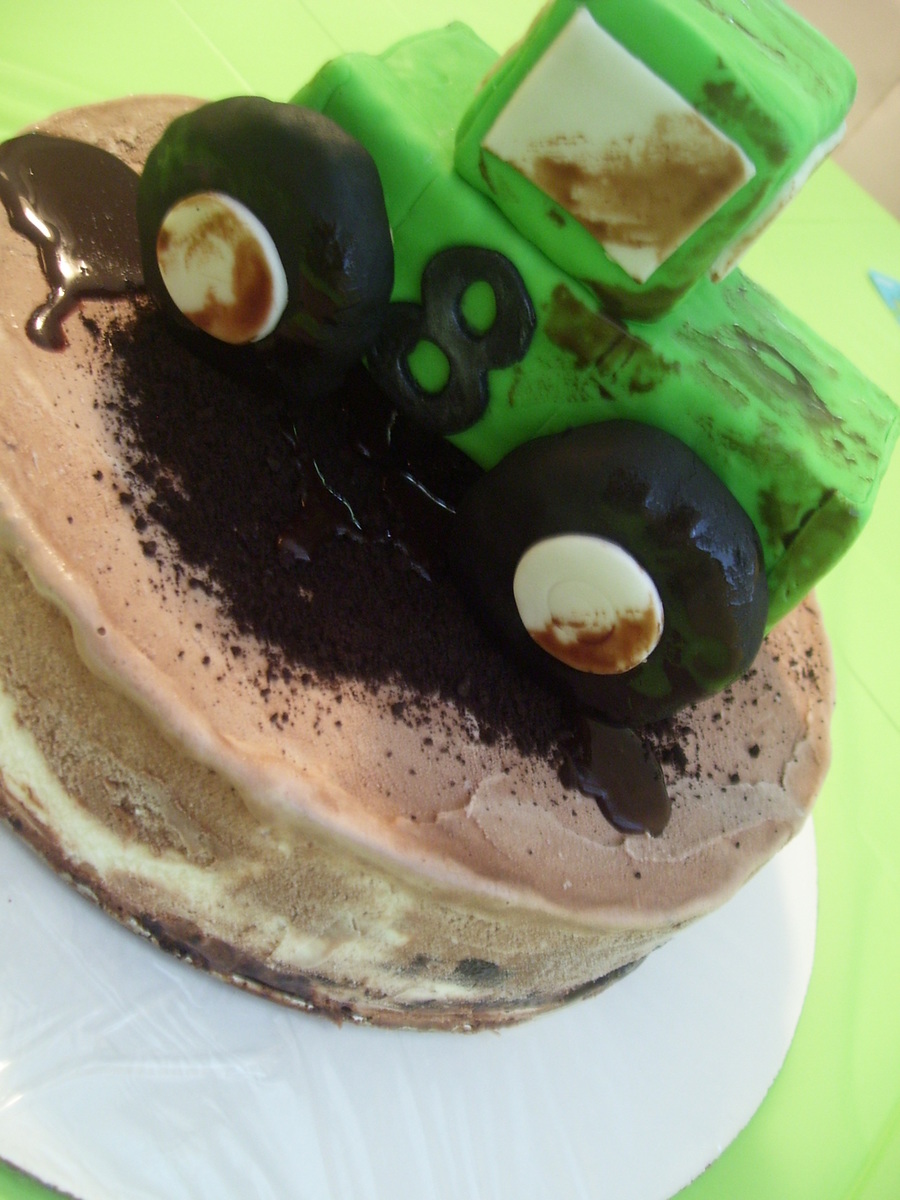 A lot of firsts for me on this cake... First time making an ice cream cake. Cake is vanilla and chocolate ice cream with Oreo crumbs and chocolate fudge filling (DQ style) Topped with Oreo crumbs and choc. fudge for 'mud' the truck was my first attempt at RKT... I say attempt again! LOL. Covered in fondant. This was for my son's b-day.
