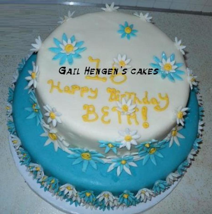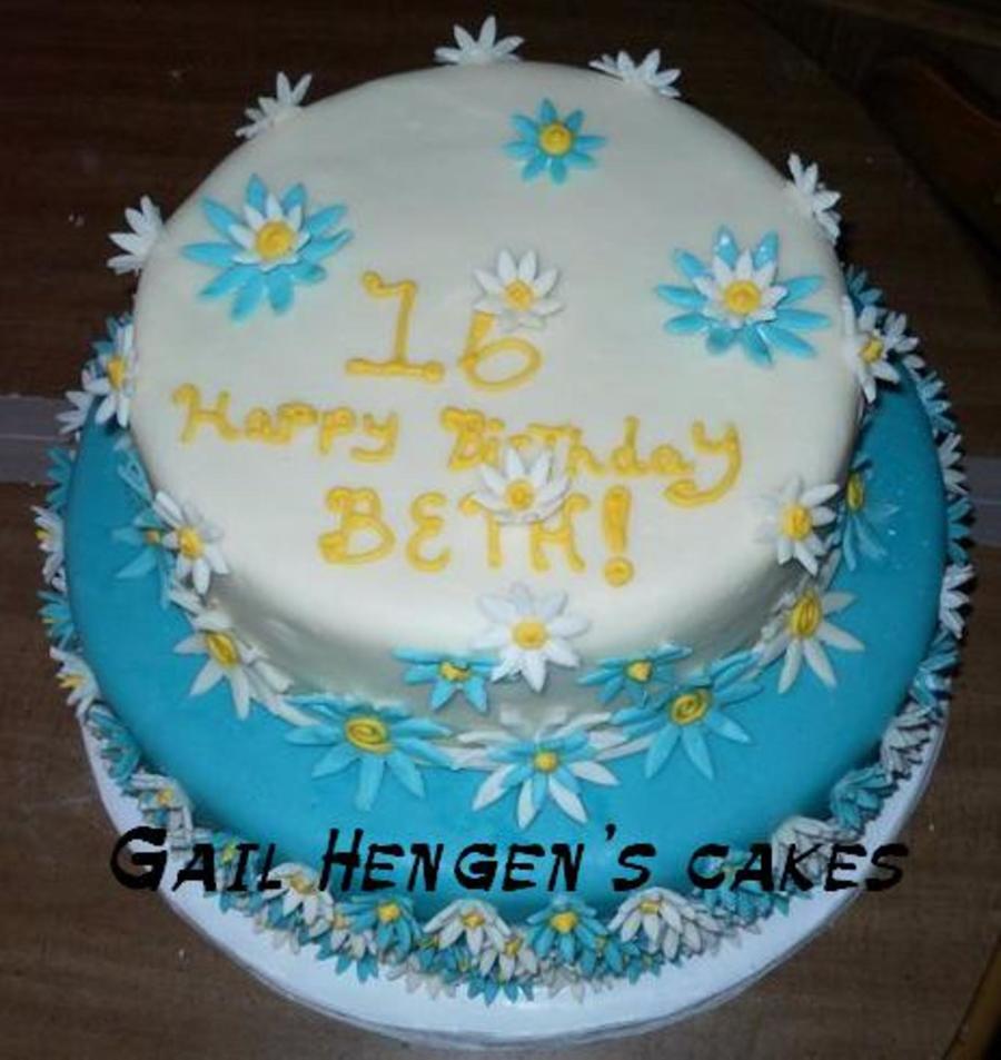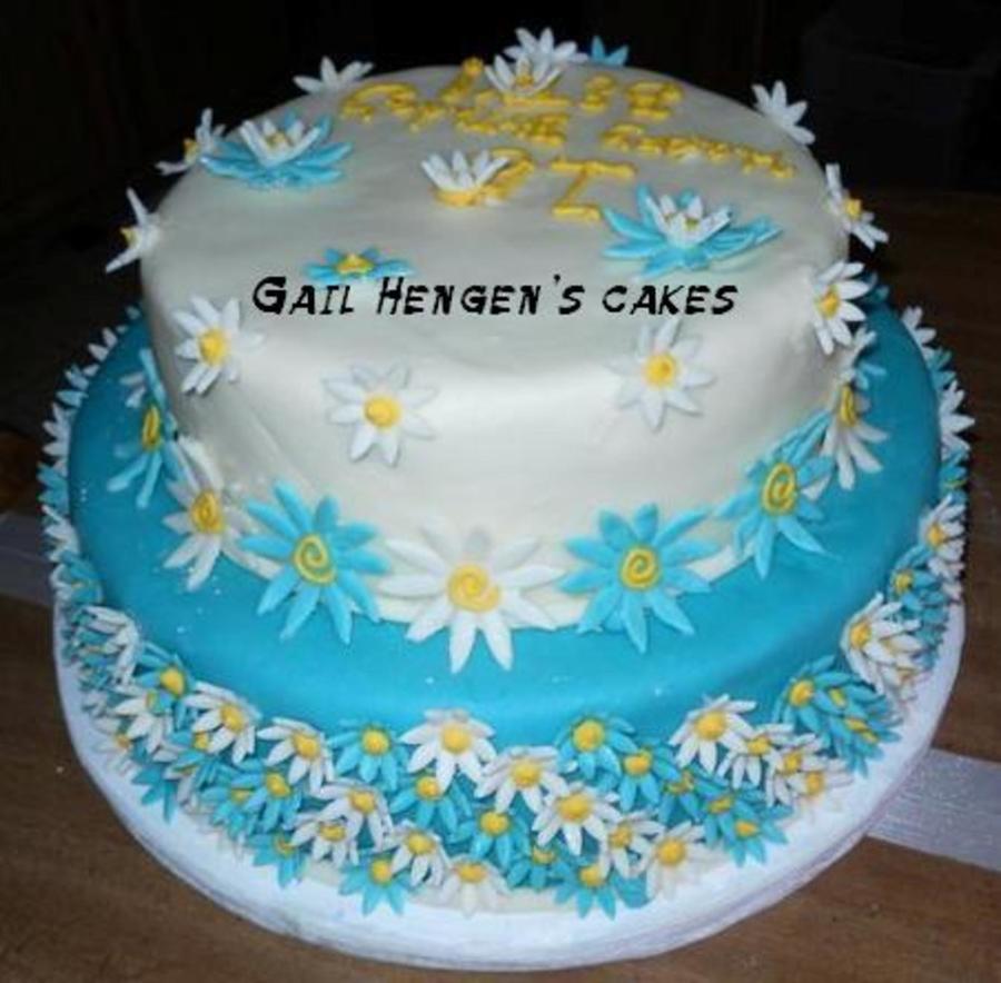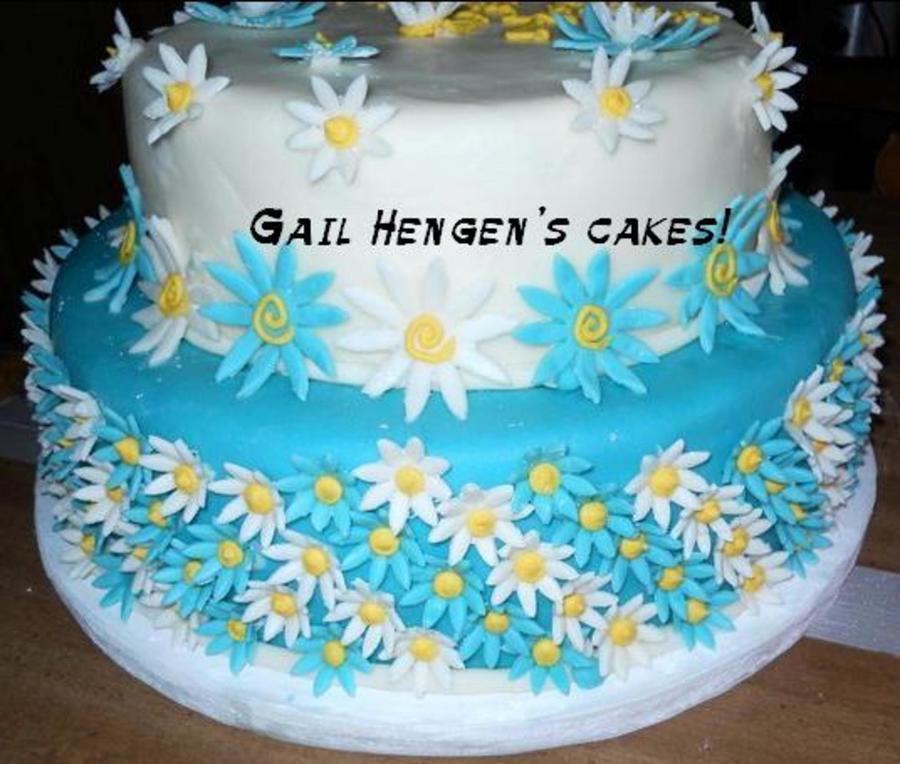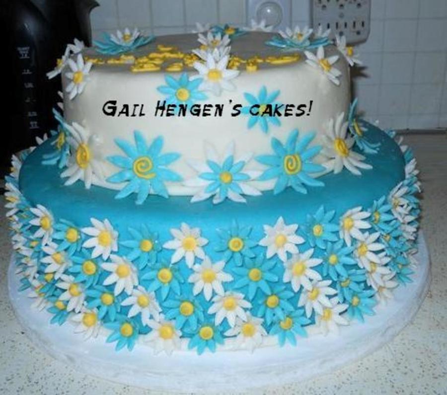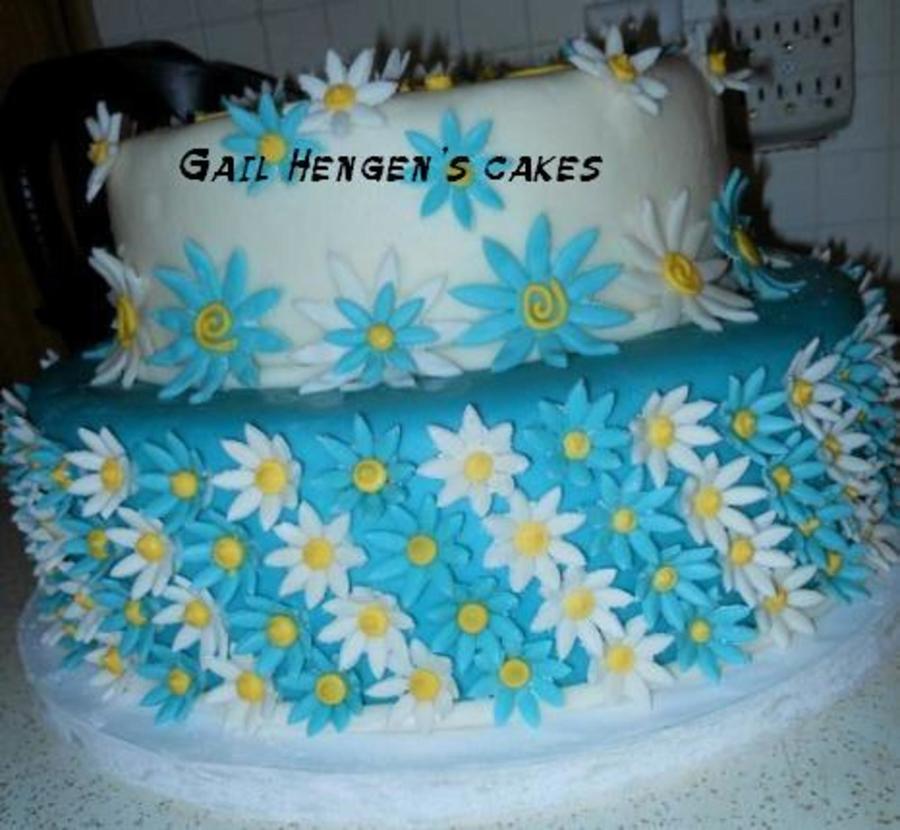 B-day girl wanted a cake covered with daisies and the color Teal! i had to abandon the topper i had prepared- it malfunctioned lol. bottom cake WASC (white almond sourcream cake) Top- Devils food chocolate- filling plain buttercream as requested. the blue shade was more greenish/ and looks like Actual Teal in person. the photo makes it look like a light or sky blue which its not. cake fondant is MMF, flowers are MMF/Gumpaste- 50/50 mix.
