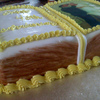 Vanilla cake,Vanilla buttercream for the crumb coat,covered in fodant,Fondant & buttercream decorations.Customer wanted it very simple no flowers ect...Just yellow and white.