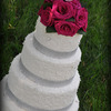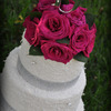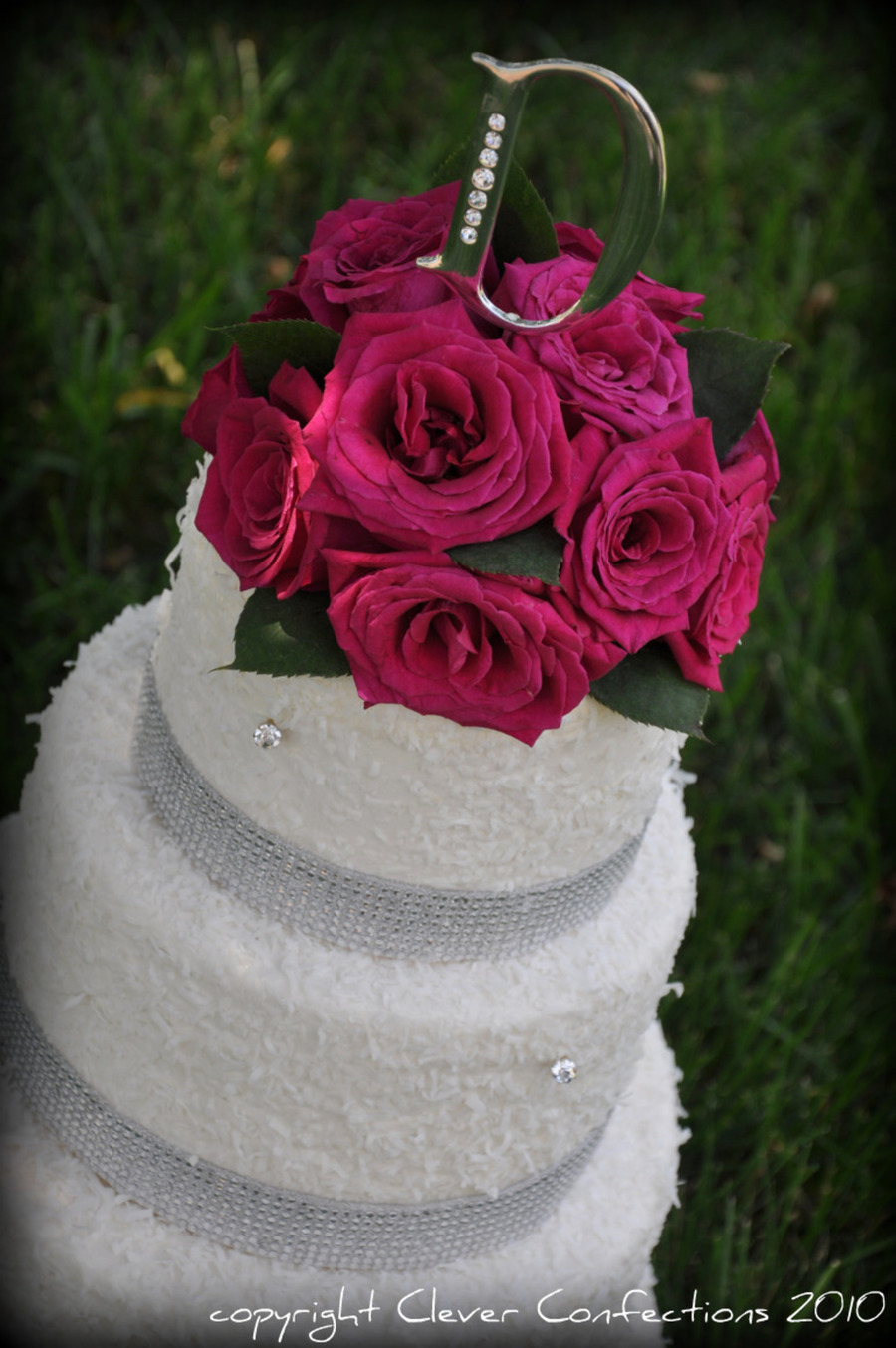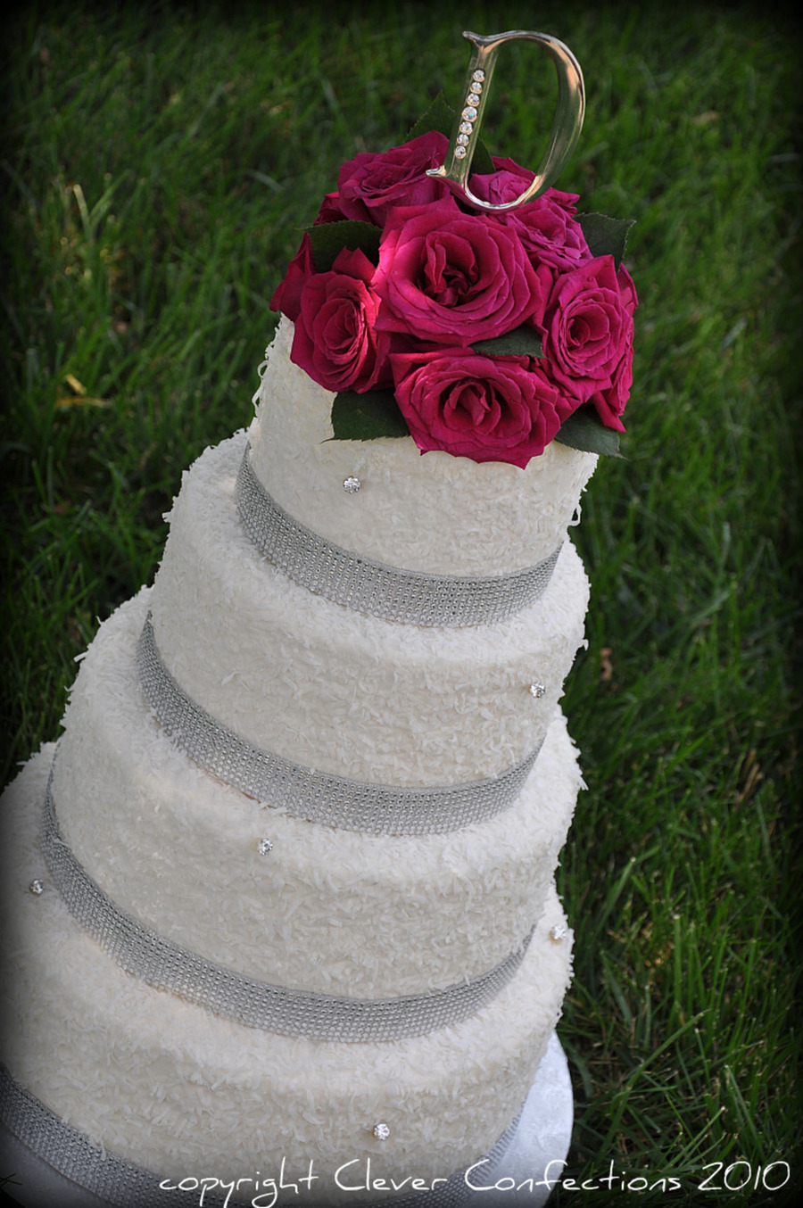 This bride wanted a cake that would make her SATC (s-e-x and the city) girls proud! She loves hot pink and she loves BLING, so.....6-8-10-12" fondant covered tiers brushed with a very thin layer of piping gel to make them tacky to accept the non-sweetened coconut! Rhinestone ribbon border with elegant rhinestone studs placed here n' there (to be removed prior to serving) with fresh hot pink roses and monogram topper