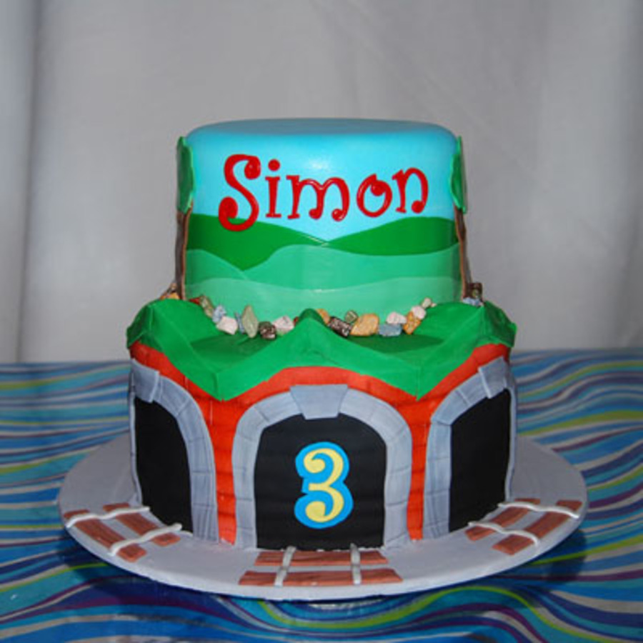 For a "Thomas" themed birthday. Top tier is fondant wraps and the bottom tier is airbrushed fondant for the bricks and fondant tunnels. Chocolate rocks between the 2 tiers. This cake was a lot of fun!
