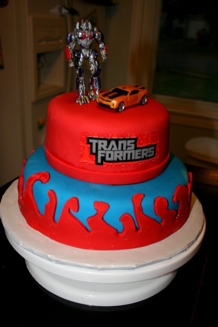 My son is obsessed with Transformers, so naturally for his 5th birthday that was the theme. Confetti cake covered in fondant with a couple of his toys as the topper. I'm still practicing with fondant, but my son loved it! :)