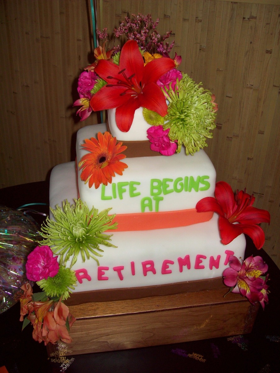 Retirement cake for my mom and her co-worker. Covered in fondant with fondant details and fresh flowers.