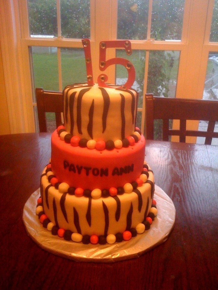 Payton Birthday Cake cake: 4 inch - pink with black zebra stripes 8 inch - tye die: pink, purple, green, blue 10 inch - pink all frosted in buttercream (indydebi's recipe) and covered with MMF - decorated with fondant balls and gumpaste stripes.