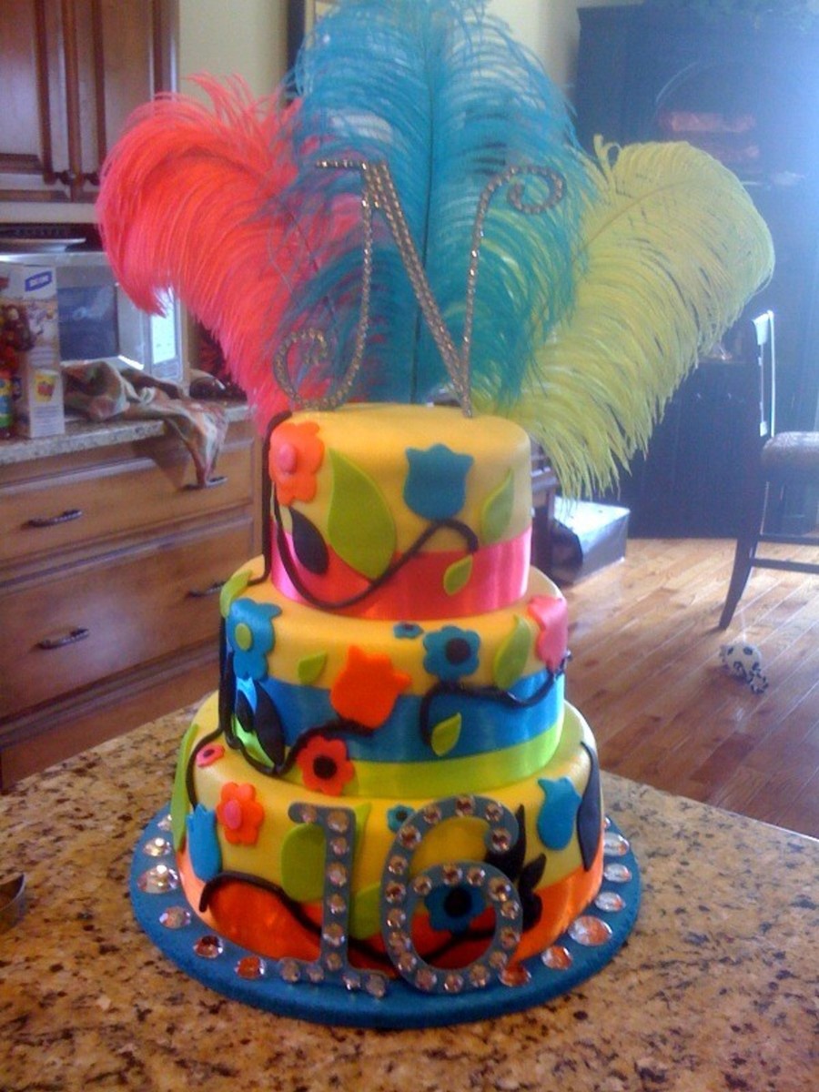 1st layer - tye dye 2nd layer - orange and pink 3rd layer - green and blue buttercream icing (indydebi recipe) covered in MMF flowers MMF