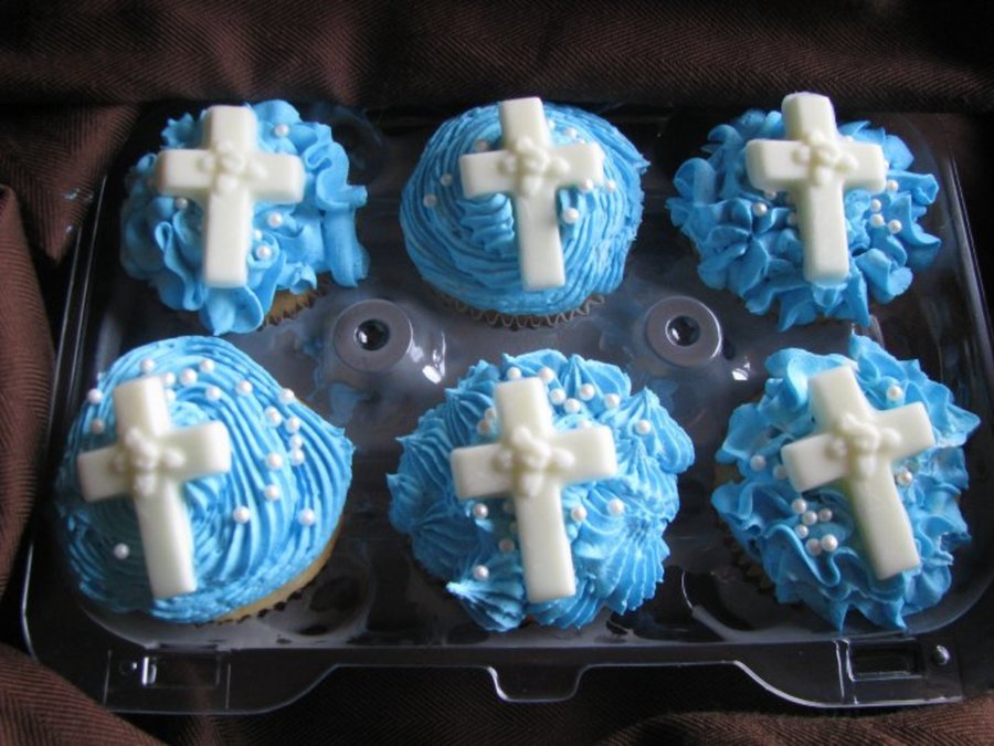 Chocolate cupcakes with buttercream frosting for a boys baptism party