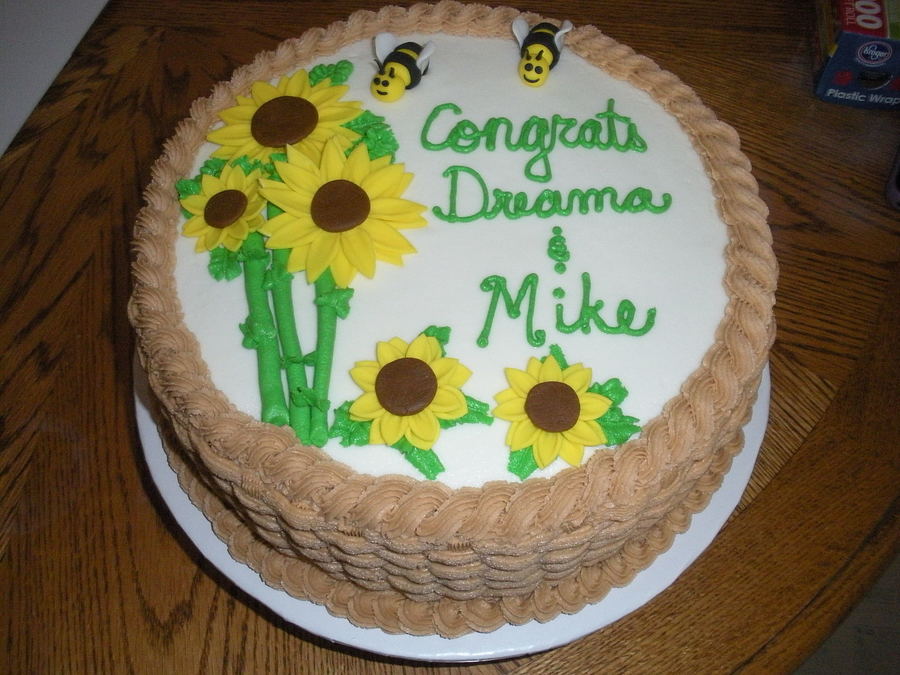 My first basket weave cake. So much easier than trying to smooth it. :P Fondant accents on white cake with buttercream icing.