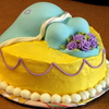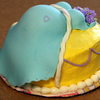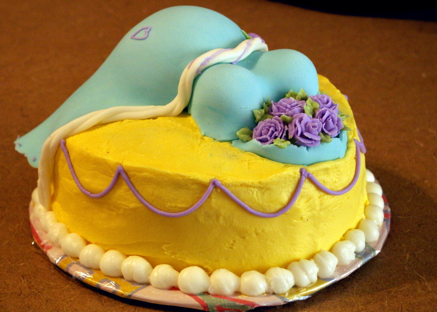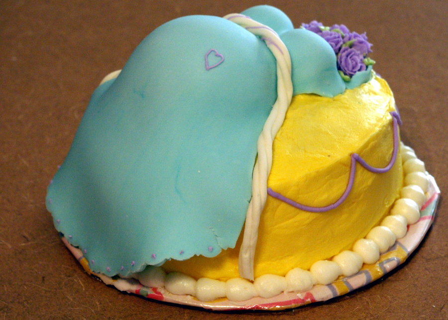 Belly and Top are shaped with rice cereal treats. Cake iced in buttercream with MMF dress. The mini-roses are my favorite detail -- they are piped with that little bitty rose tip (whose number I forget)