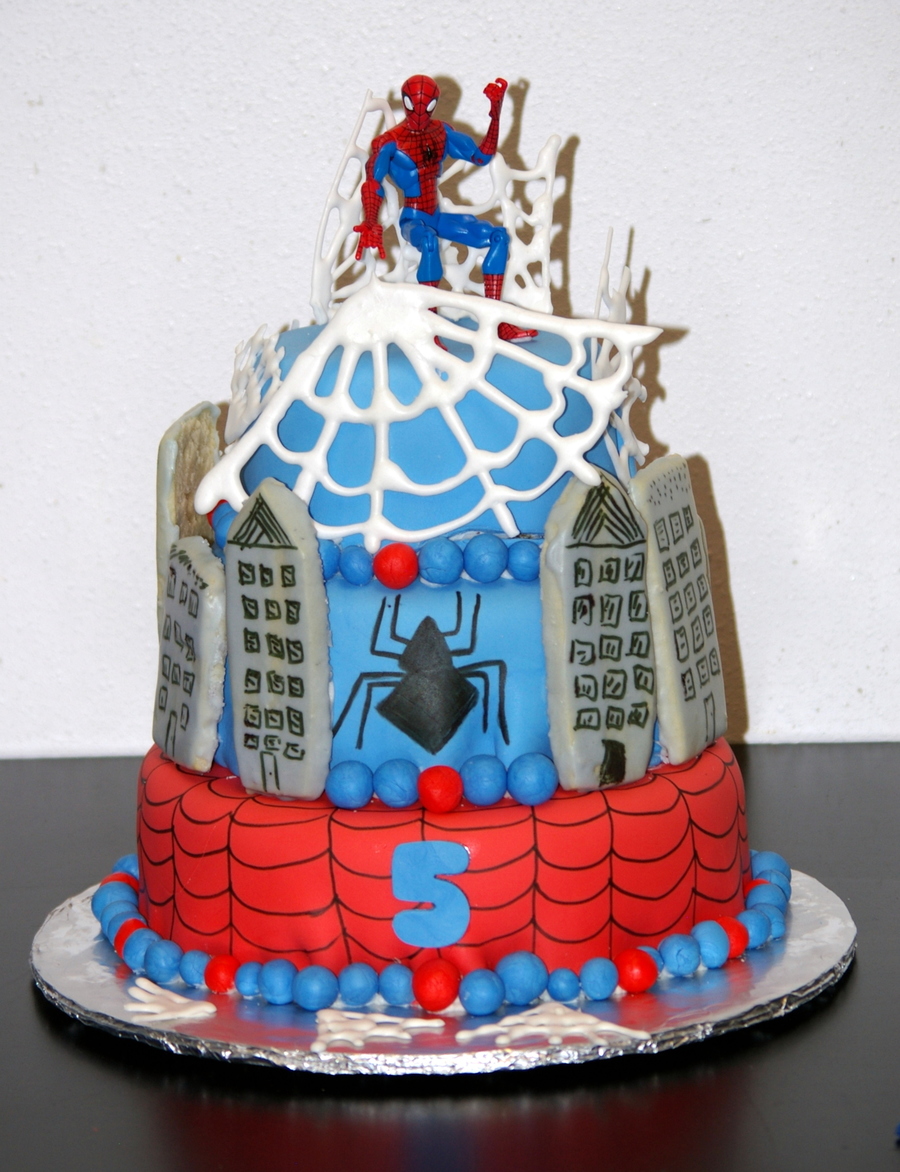 A tiered Spiderman City cake inspired by CC artist shelleylynn -- Tiers covered with MMF, buildings are glazed sugar cookies. Black details were mostly done with Foodwriter pen.