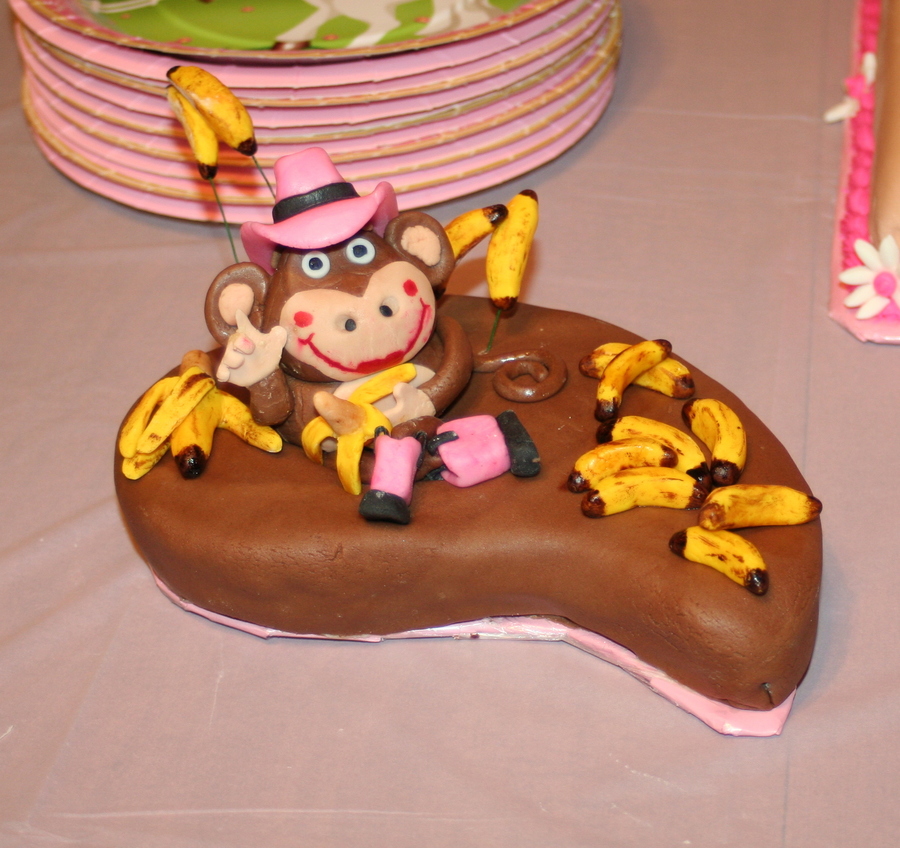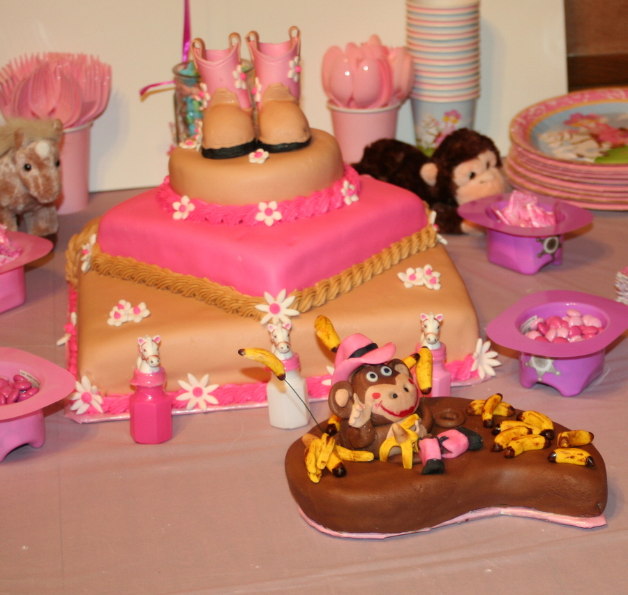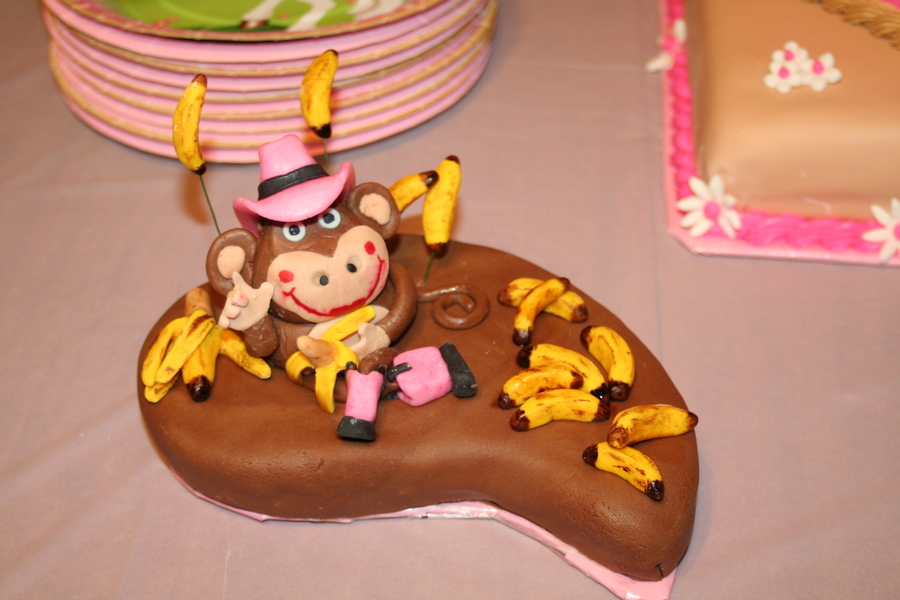 This was a personal (smash) cake for my grand-daughter's 1st birthday. Her mom calls her "little monkey" but her dad and I call her "our little cowgirl"...hence the monkey with pink cowgirl hat and boots. The main cake can be found on here too