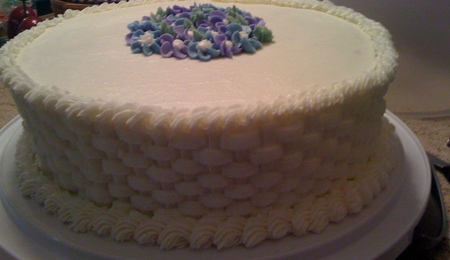This was my first wedding cake. It was for my cousins wedding, they were happy with it. It was just white and chocolate. I didn't have my camera, i just had to use my phone, so it isn't a very good picture.