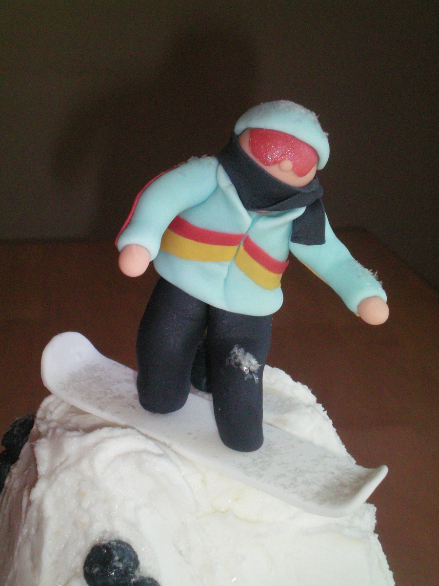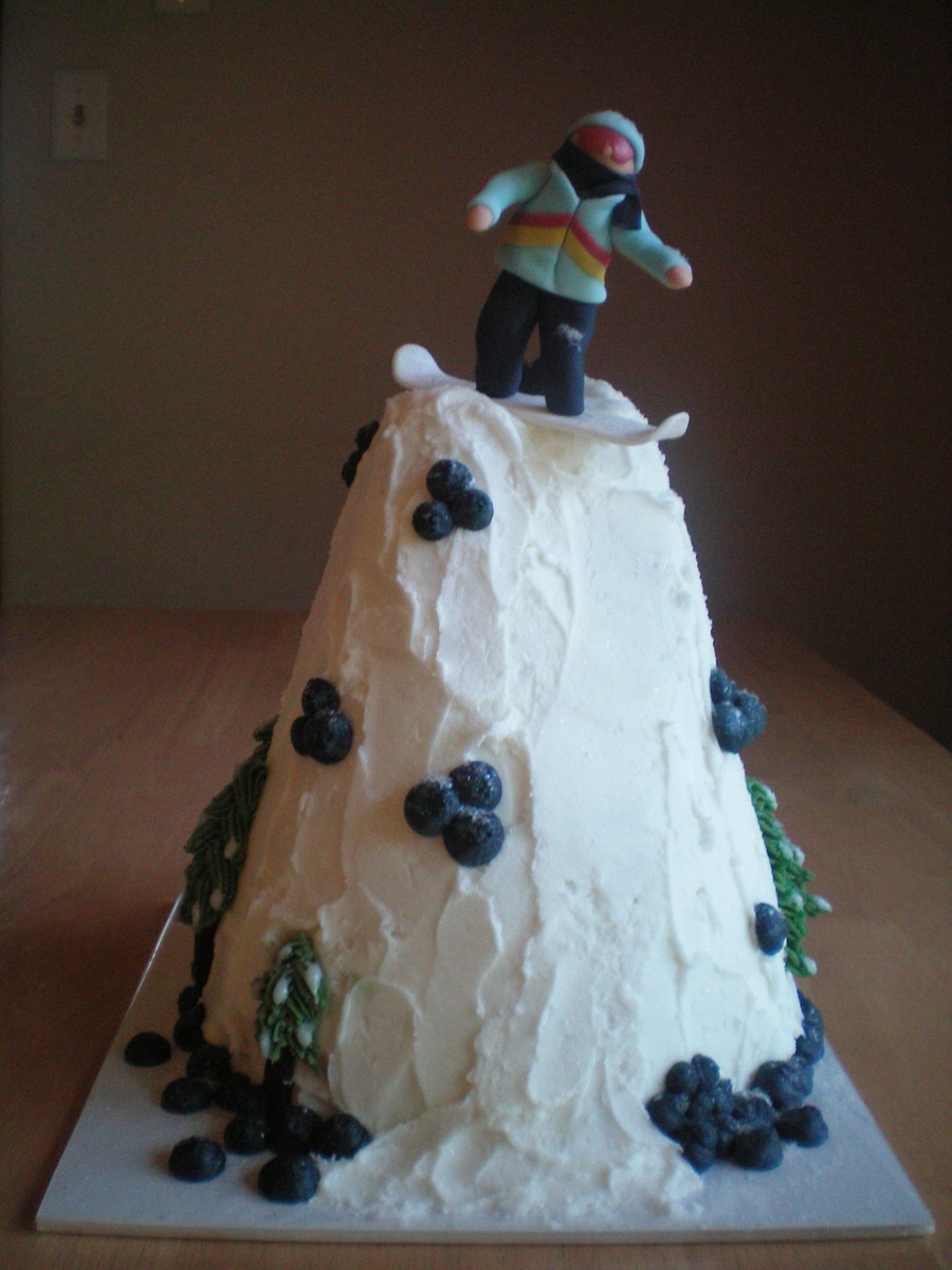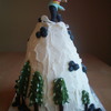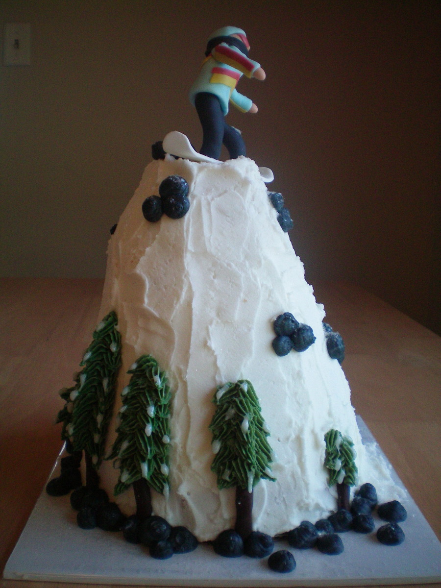 5 layers of cake, carved with a fondant guy on top. Buttercream trees with modeling chocolate trunks around the back of the mountain.