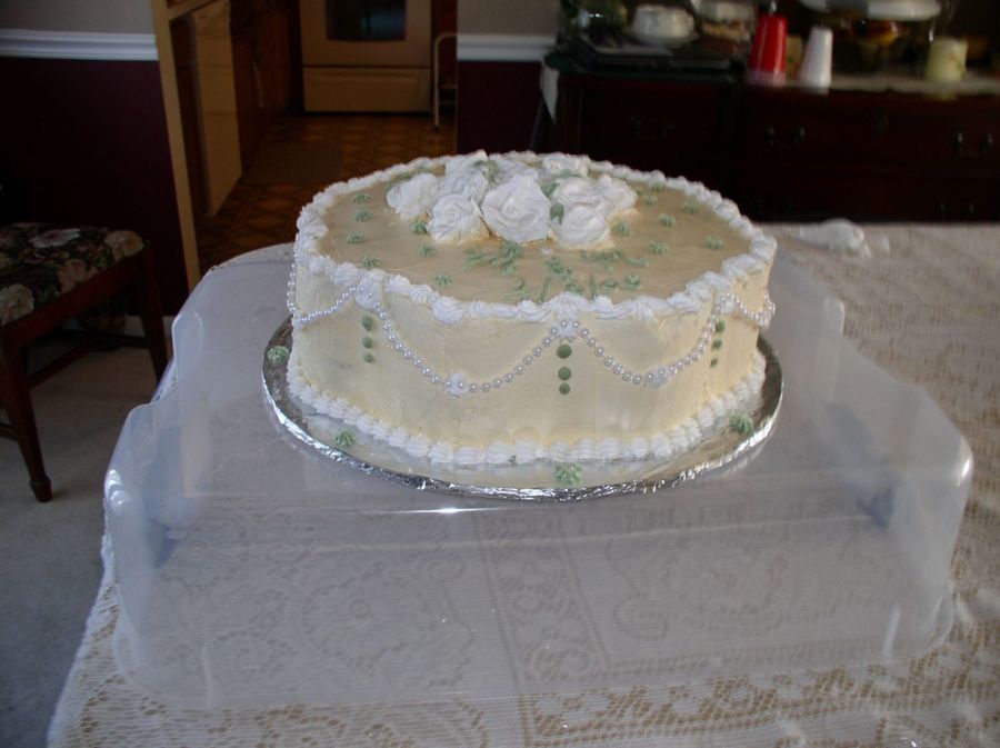 This cake was made for a bridal shower. It is a double layer marble 15inch petal pan, Ivory icing with white trim and juniper green leaves and trim.