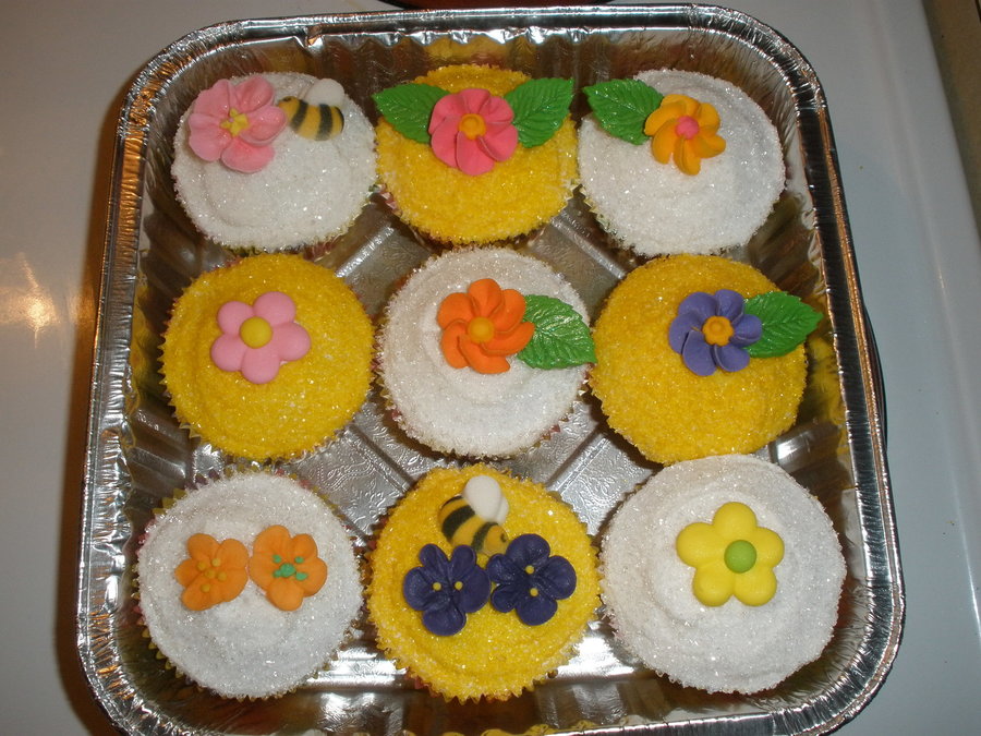 This areyellow butter cupcakes with buttercream icing, white sugars and royal icing flowers. Also sugar bees.