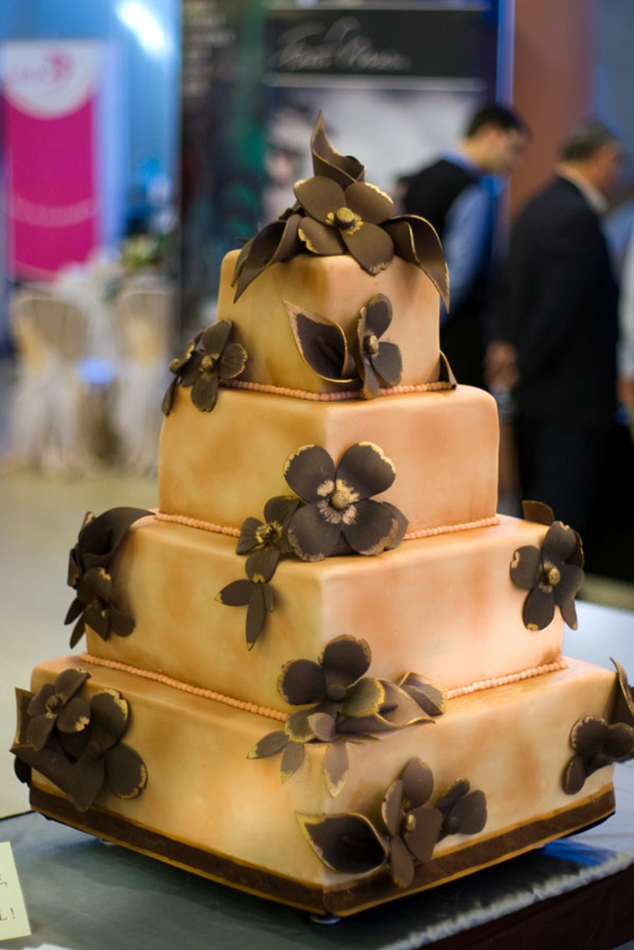 the fondant on the cake was airbrushed unevenly with copper color and the flowers painted on the borders and in the middle