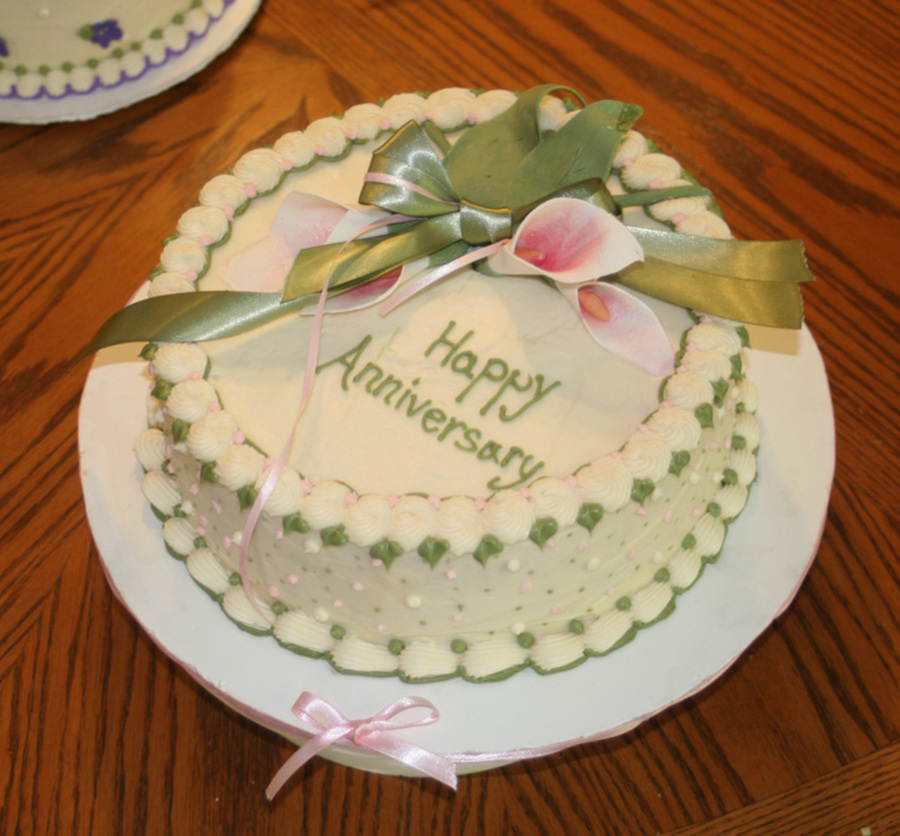 White 10" round with cream cheese frosting and gumpaste calla lillies.