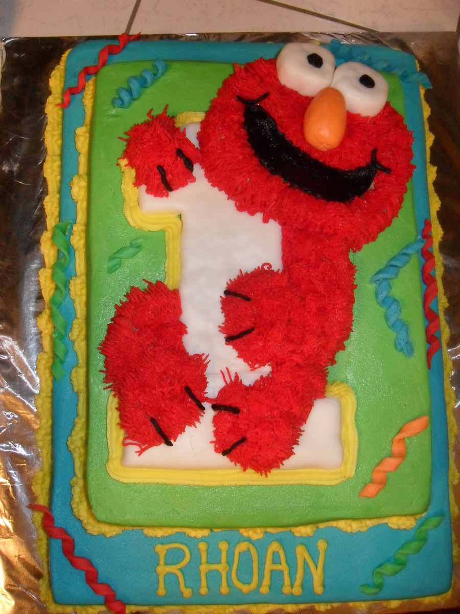 1st birthday-buttercream with fondant accents, elmo and no 1 is rice krispy treats.