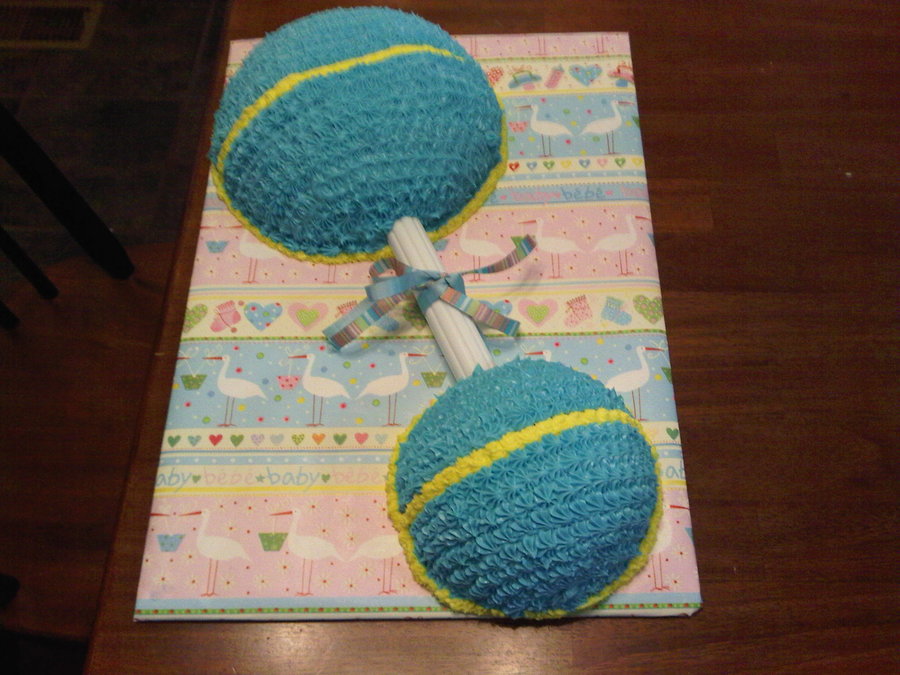 This was my first Baby rattle cake and it was so easy and fun! I used the soccer ball pan and the small ball pan. I used plastic dowel for the handle!